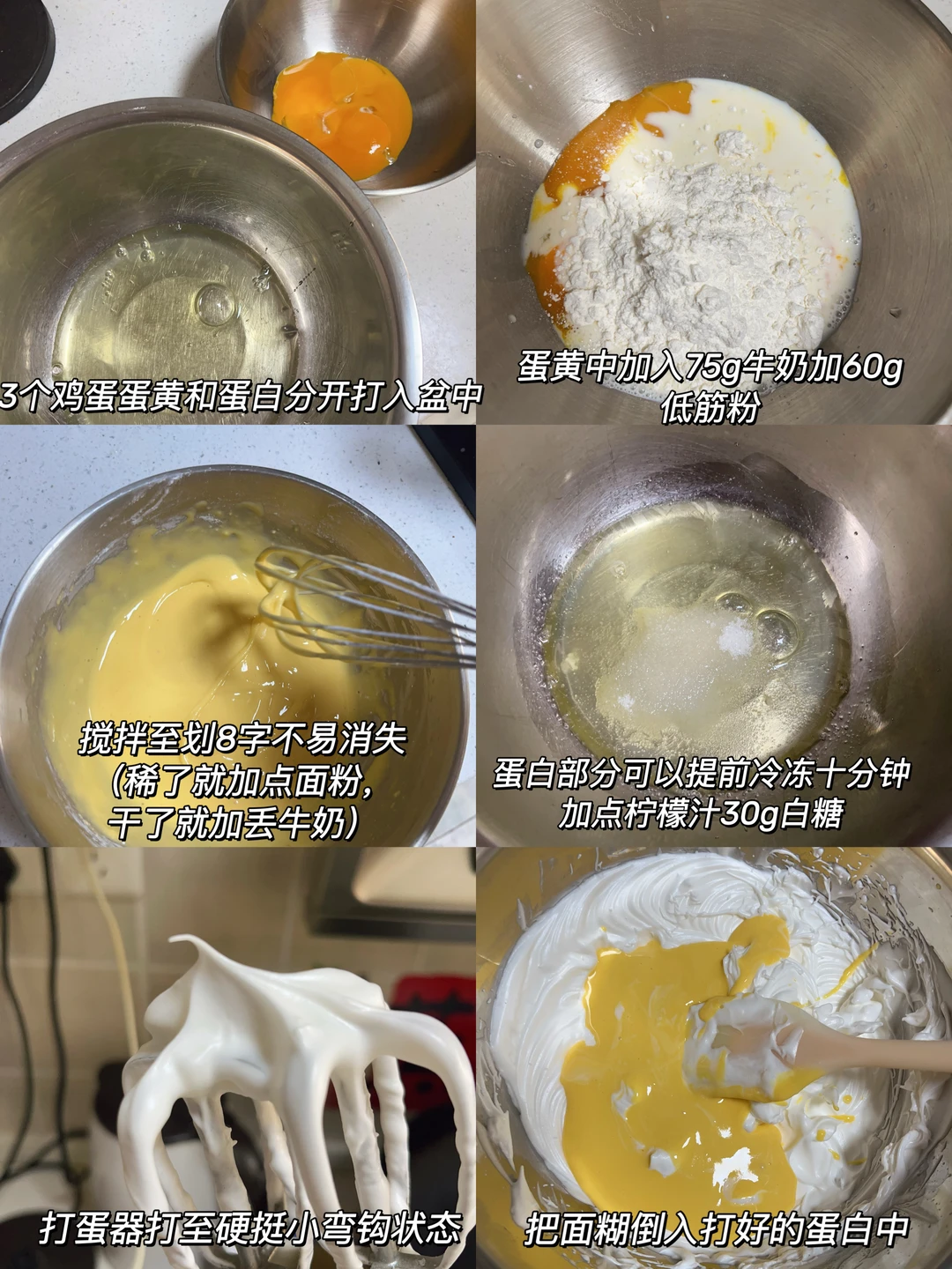 1⃣️3个鸡蛋蛋清蛋白分开用盆装,蛋黄中加75g牛奶60g低筋粉,搅拌至划8字不易消失状态(这里如果面糊稀了就加点面粉,干了加点牛奶)