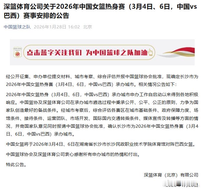 【中国女篮热身赛具体安排出炉:长沙、武汉承办】今日官宣中国女篮热身赛具体安排,确定长沙市为2026年中国女篮热身赛(3月4日、6日,中国vs巴西)承办城市,比赛场馆为长沙民政职业技术学院体育馆。另外一场热身赛则将于2026年3月8日在武汉市洪山体育中心体育馆进行,由中国女篮对阵捷克女篮。中国女篮女篮世界杯