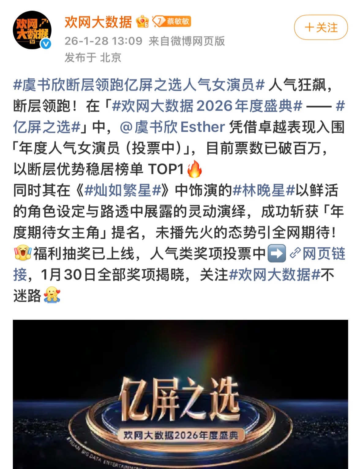 虞书欣牛,我家亿分女就这么棒,期待一下待播剧《灿如繁星》和正在拍的《云初令》吧虞书欣断层领跑亿屏之选人气女演员