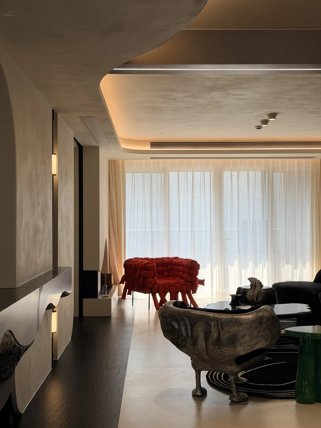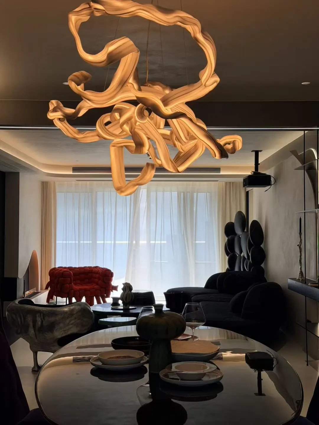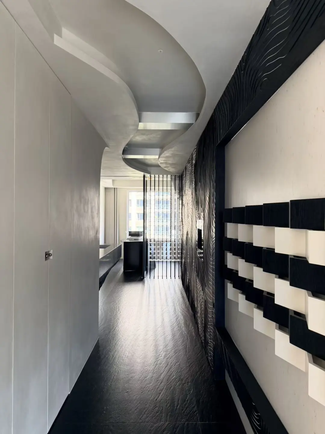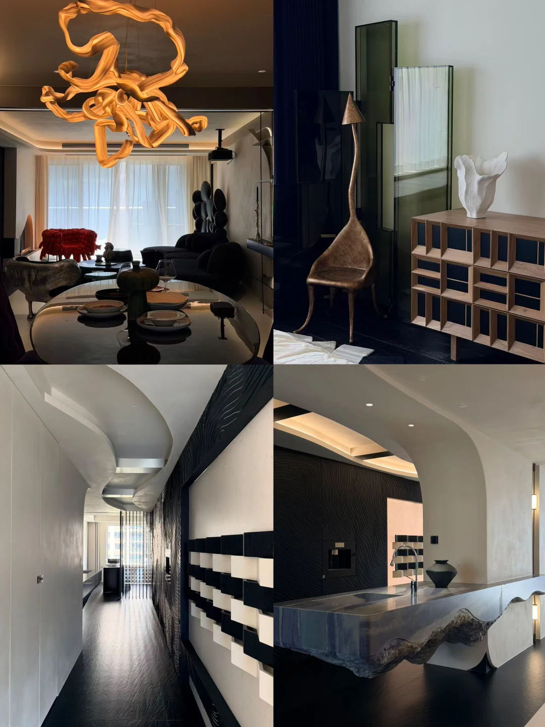 谁能拒绝把家变成每天都逛的艺术展啊! 原本是观云钱塘城的精装大平层,被我们彻底改造成了偏艺术风的居住空间。 黑调基底 + 艺术装置 + 不规则线条,每一处都在打破常规的沉闷感。 客餐厅的流动感吊灯,像凝固的金色云朵,是整个空间的视觉重心。 走廊的弧形天花和黑白艺术装置,走进去就像在逛美术馆。 儿童房的彩色插画和俏皮墙面线条,让童趣和艺术感完美融合。 连浴室的整面原石台面,都自带肌理艺术的松弛感。 生活不该只是柴米油盐,更要有随时能沉浸其中的艺术氛围 在江景里醒来,在艺术里生活,这大概就是理想中的家了吧!