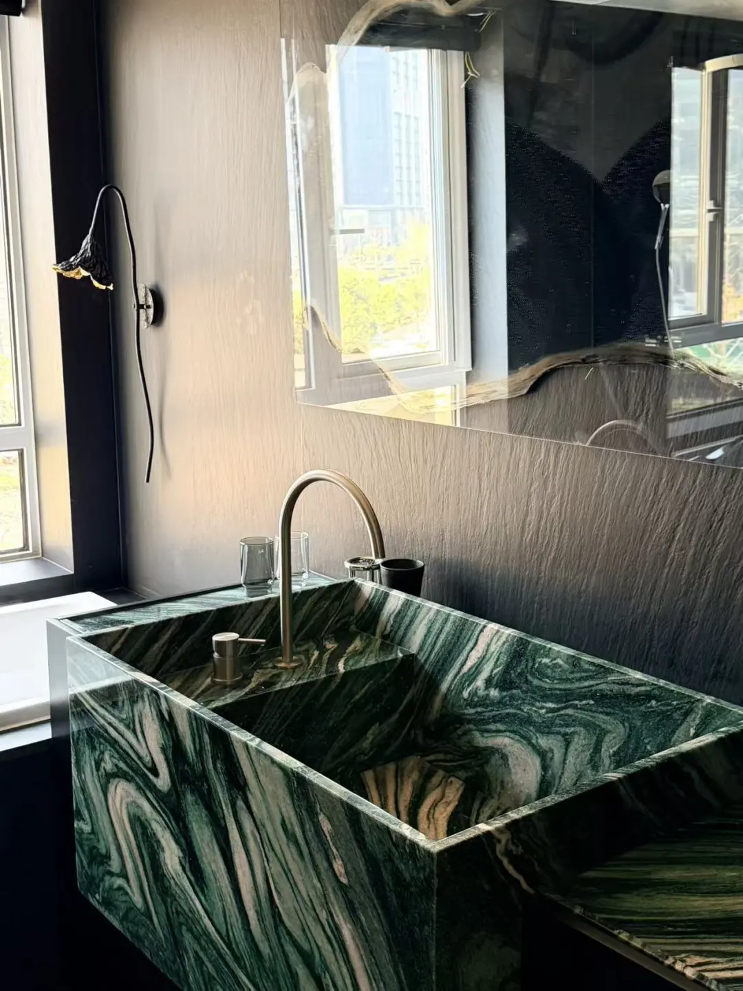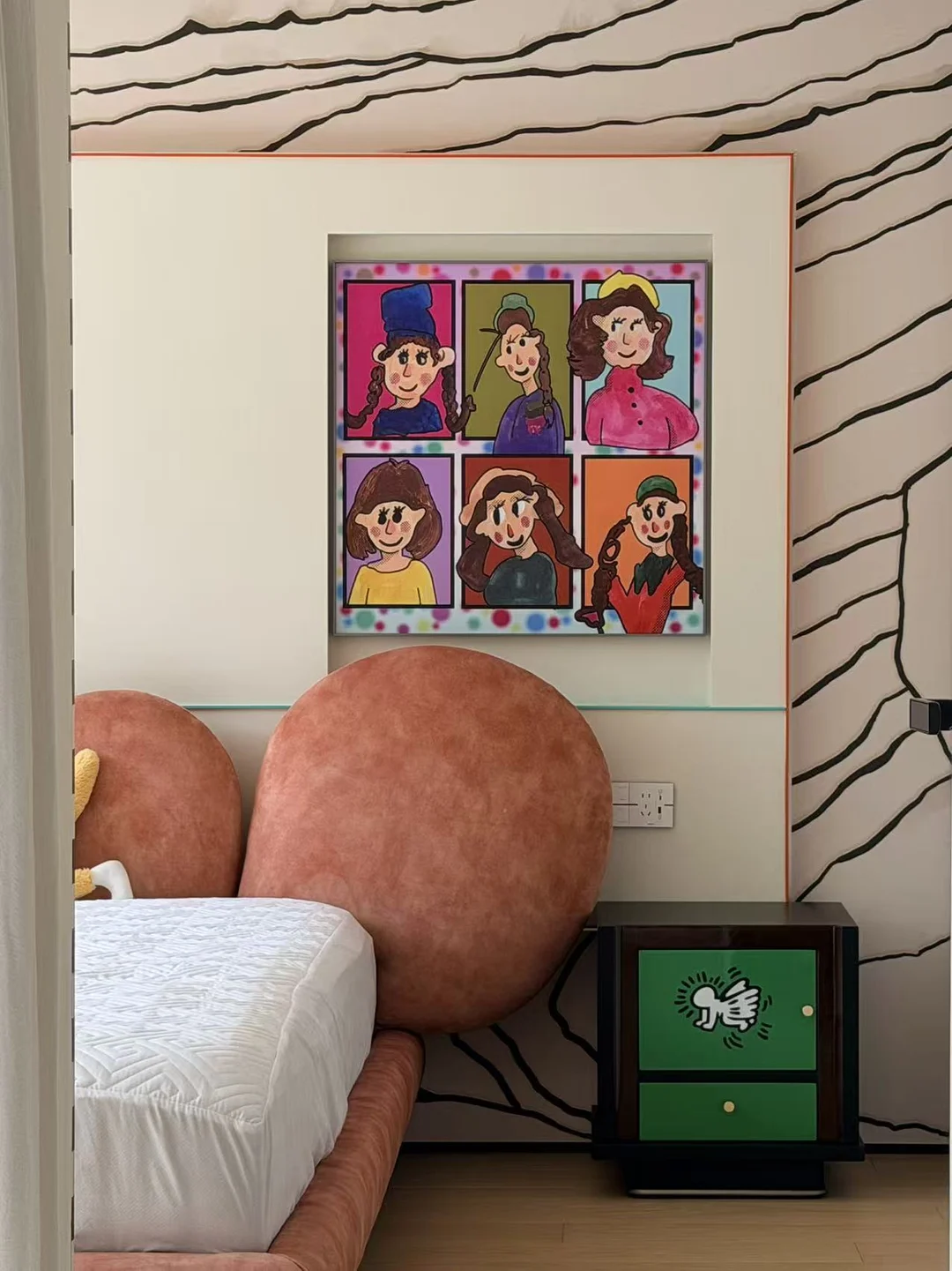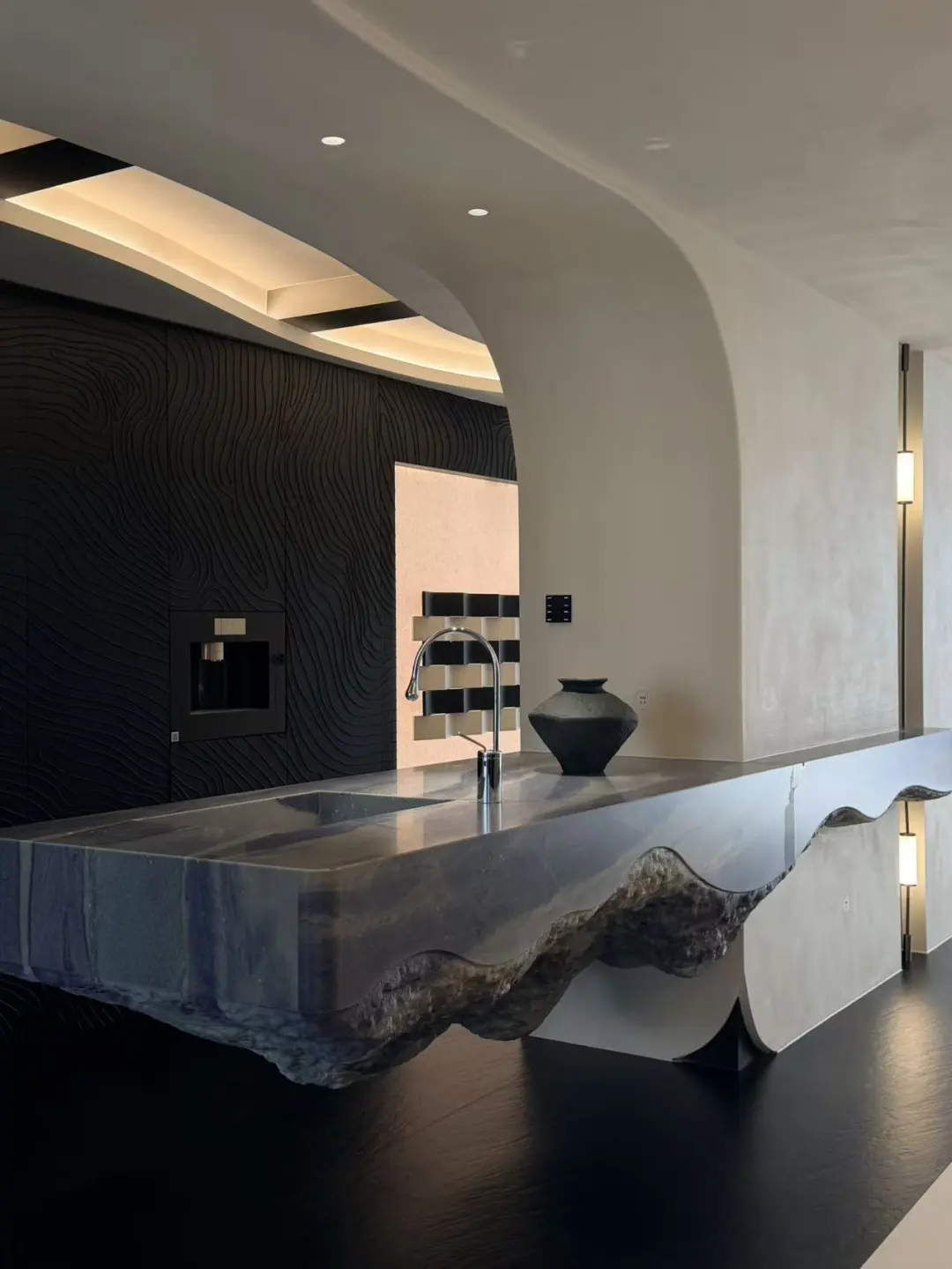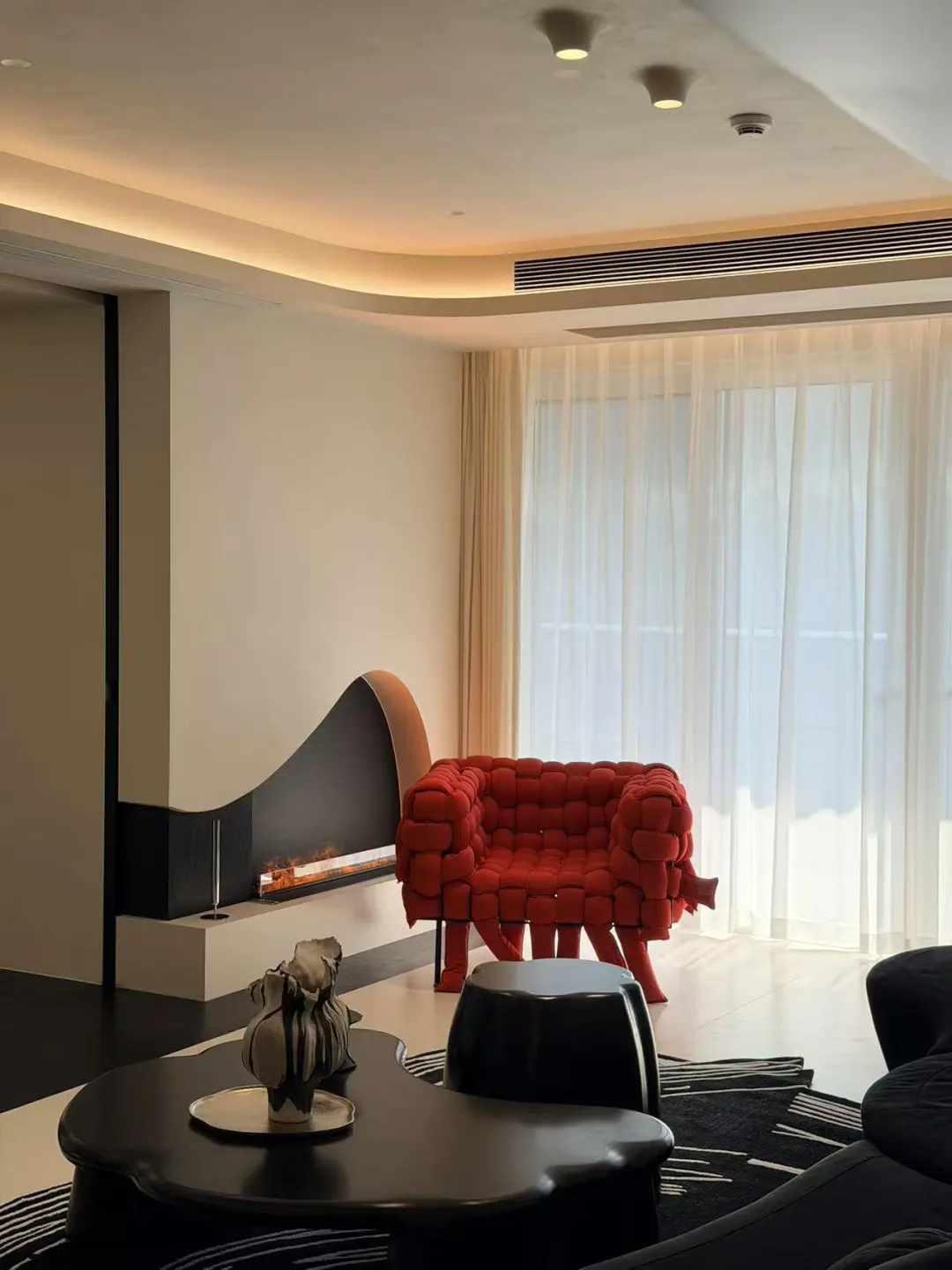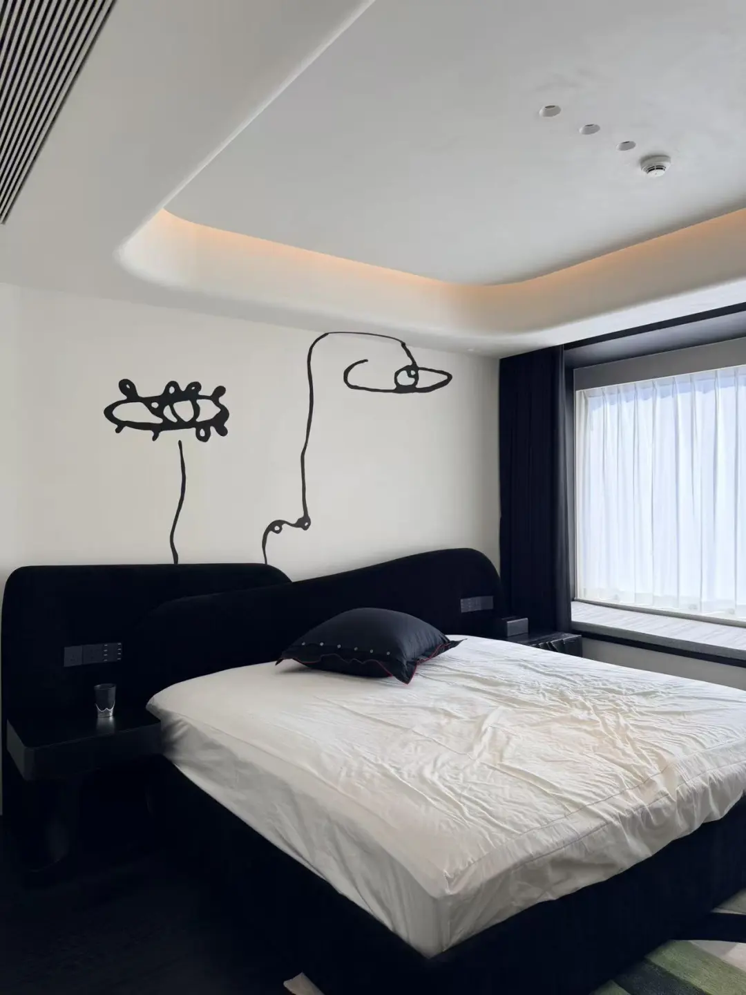 谁能拒绝把家变成每天都逛的艺术展啊! 原本是观云钱塘城的精装大平层,被我们彻底改造成了偏艺术风的居住空间。 黑调基底 + 艺术装置 + 不规则线条,每一处都在打破常规的沉闷感。 客餐厅的流动感吊灯,像凝固的金色云朵,是整个空间的视觉重心。 走廊的弧形天花和黑白艺术装置,走进去就像在逛美术馆。 儿童房的彩色插画和俏皮墙面线条,让童趣和艺术感完美融合。 连浴室的整面原石台面,都自带肌理艺术的松弛感。 生活不该只是柴米油盐,更要有随时能沉浸其中的艺术氛围 在江景里醒来,在艺术里生活,这大概就是理想中的家了吧!