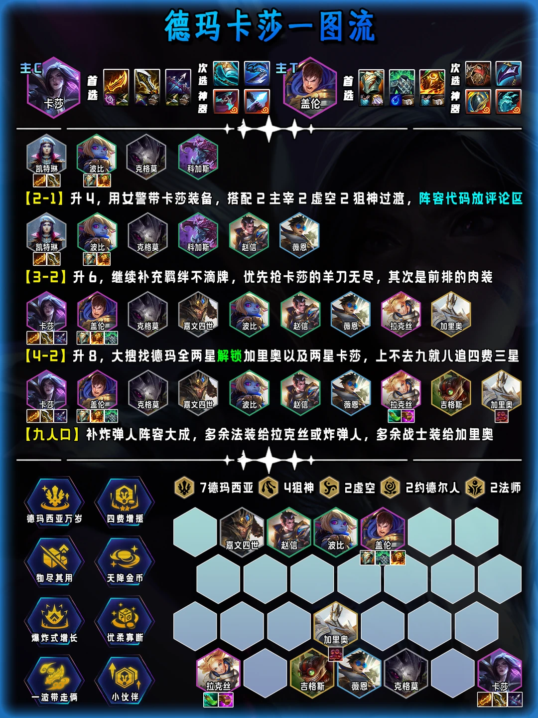 家人们谁懂啊!德玛卡莎把把乱杀,把把吃分吃到手软! ⭐️核心思路⭐️ 1️⃣2-1拉4人口,用女警带卡莎装备,搭主宰+虚空+狙神过渡 2️⃣3-2拉6人口,稳血补羁绊,优先拿卡莎的羊刀+无尽 3️⃣4-2拉8人口,大搜找两星盖伦、加里奥和卡莎,锁血直接冲! 4️⃣9人口补💣人,多余法装给拉克丝,肉装给加里奥,阵容直接大成! 💡海克斯💡 德玛西亚万岁、四费增援、物尽其用,拿到直接爽局! 📌划重点:这套成型快、上限高! 不管是打前排还是切后排都猛得一批 新手也能轻松上手,赶紧拿去冲分!
