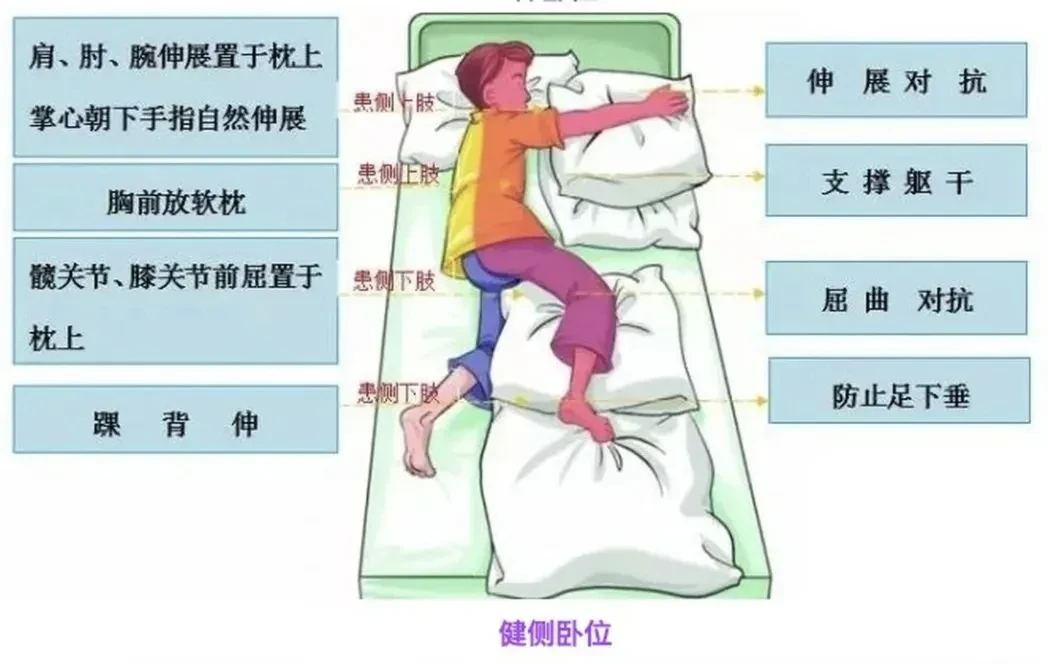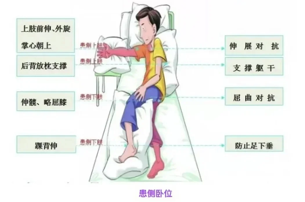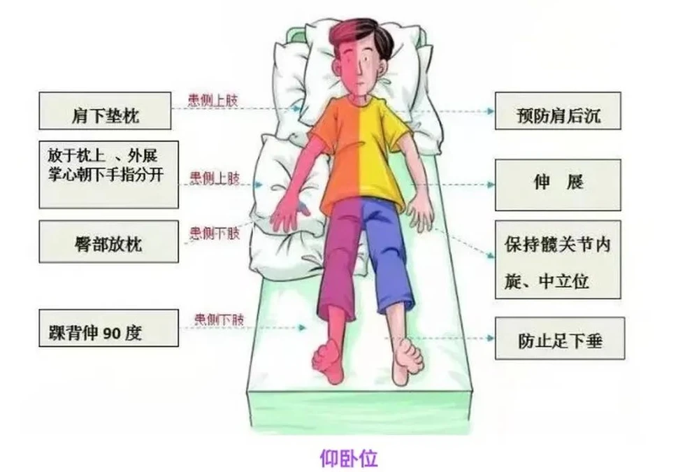 1.摆放时避免拖、拉、拽患侧肢体,尤其是肩关节。 2.定时变换体位,每1-2小时更换一次,减少压疮和肌肉痉挛风险。 3.保持室内温度适宜,避免寒冷导致肌张力增高。4.患侧腕及手指充分放松,不抓握物品;足底不放任何东西。5.密切观察皮肤状况,尤其是骨突部位,预防压疮。