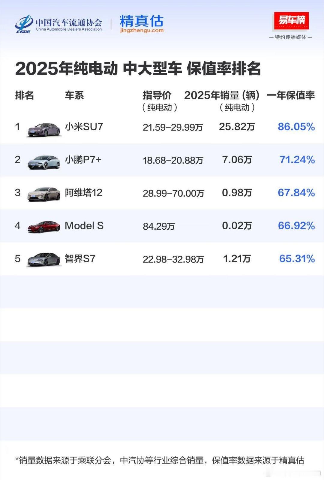 易车提供的中国汽车流通协会精真估,2025年纯电动车型保值率最高的是小米Su7,一年保值率是86.05%,在中大型电动轿车中保值率领先第二名15.19%,这个保值率相当不错了!小米汽车