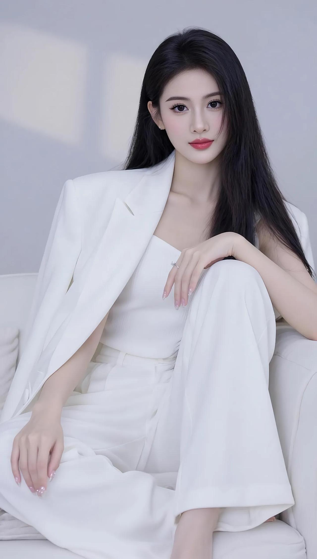 优雅白色西装美女,温柔坐于沙发上,散发迷人魅力