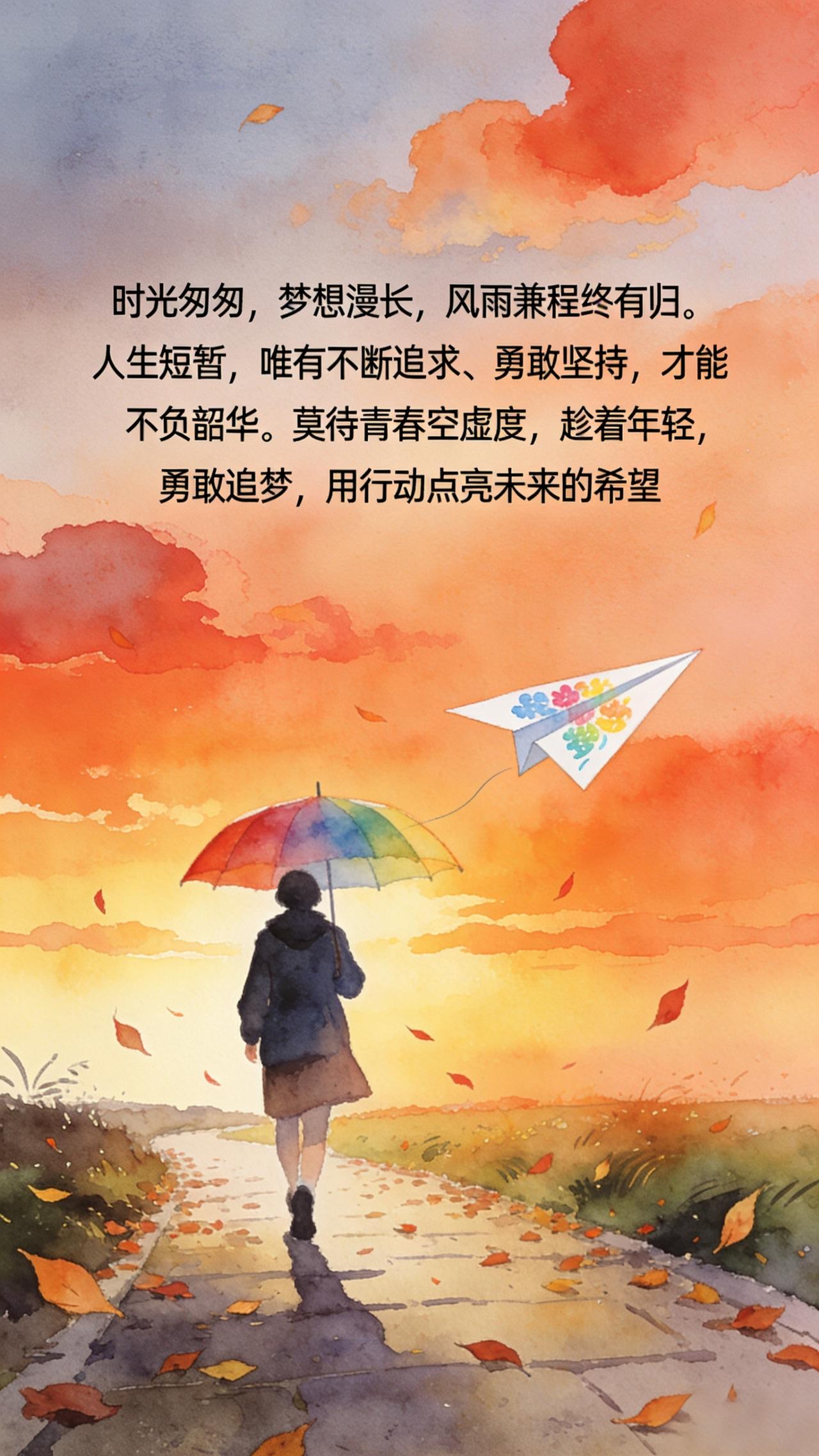 时光匆匆,梦想漫长,风雨兼程终有归,莫待空叹青春逝 在这个快节奏的时代,时间如白驹过隙,转瞬即逝。我们每个人都在奔跑、追逐自己的梦想,但往往在不经意间,青春已悄然流逝。有人说,人生如白驹过隙,稍纵即逝。我们是否曾在忙碌中迷失自己,是否曾在追梦途中忘记了停下来欣赏沿途的风景? 时光匆匆,岁月不待人。 回首过去,曾经的梦想或许还在心中萦绕,但现实的压力、生活的琐碎常常让我们迷失方向。有人在奋斗中坚持,有人却在迷茫中徘徊。其实,人生的意义不仅在于追逐,更在于在奔跑中找到属于自己的节奏。正如那句古话:“莫待无花空折枝”,不要等到青春已逝,才后悔当初没有勇敢追梦。 梦想漫长,但只要坚持,终会到达。 每个人的梦想都不同,有人渴望事业的成功,有人追求家庭的幸福,有人希望实现自我价值。无论梦想多么遥远,只要我们心怀热忱,脚踏实地,就一定能走到终点。就像那句古诗:“路漫漫其修远兮,吾将上下而求索。”追梦的路上,难免会遇到挫折和困难,但只要坚持不懈,终究会迎来属于自己的光明。 风雨兼程,终有归途。 在追梦的道路上,我们难免会遇到风雨和挫折。有人被现实击倒,有人选择放弃,但真正的勇士,是那些在风雨中依然坚持前行的人。正是这些风雨,磨炼了我们的意志,让我们变得更加坚强。只有经历了风雨,才能迎来彩虹。 莫待青春空虚度,把握当下最重要。 青春短暂,岁月无情。不要让时间白白流逝,不要等到年华老去,才追悔莫及。把握当下,珍惜每一个瞬间,让自己的人生充满意义。无论梦想多么遥远,只要心怀热忱,脚踏实地,就能在时间的长河中留下属于自己的足迹。 人生如旅,珍惜每一段风景。 旅途中,有高山有大海,有平原有荒漠。每一段旅程都值得我们用心去感受。不要因为前方的未知而畏惧,也不要因为暂时的困难而放弃。相信自己,勇敢前行,终有一天,你会站在梦想的彼岸,回望来时的路,满怀感激。 总之: 时光匆匆,梦想漫长,风雨兼程终有归。人生短暂,唯有不断追求、勇敢坚持,才能不负韶华。莫待青春空虚度,趁着年轻,勇敢追梦,用行动点亮未来的希望。 人生感悟 追梦之路 青春不再 坚持到底