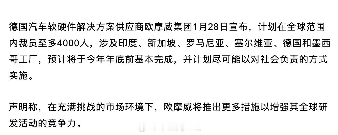 欧洲零部件企业这波输惨了,被欧洲电动化来来回回反复折腾欧摩威裁员预计将在2026年底前完成,波及全球4000个岗位 大v聊车 新能源汽车