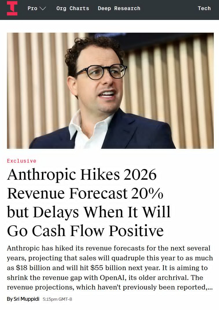 The Information:Anthropic提高了未来几年的收入预测,预计今年的销售额将增长四倍,达到180亿美元,明年将达到550亿美元;将现金流转正预期推迟到2028年;预计到2029年,Anthropic的AI模型训练成本将超过1000亿美元。