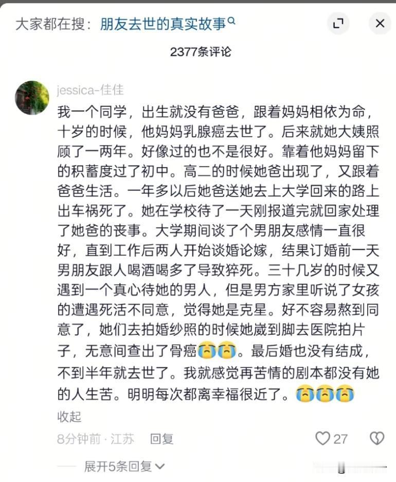 她就像余华的书,活着,里面的老头叫啥来着,也是这样,身边的所有人都离开了,悲惨的一生 村有老两口,五个孩子,大女儿得急病死了,大儿子因为家里失火一气之下上吊自杀了,三女儿出车祸死了,小儿子出事故一条胳膊没了,就二女儿没啥事,但是很早就离婚带个孩子。后来老太太疯了,生活不能自理。老头把老太太伺候死了自己也上吊了! 你若信命,命中必然皆为偶然,你若不信命,命中偶然皆为必然。如果她的出生的命已经注定人生遭遇,那其他人的相遇也是命中早已安排。这一辈子还清了所有的债,来世做个幸福被爱的人!