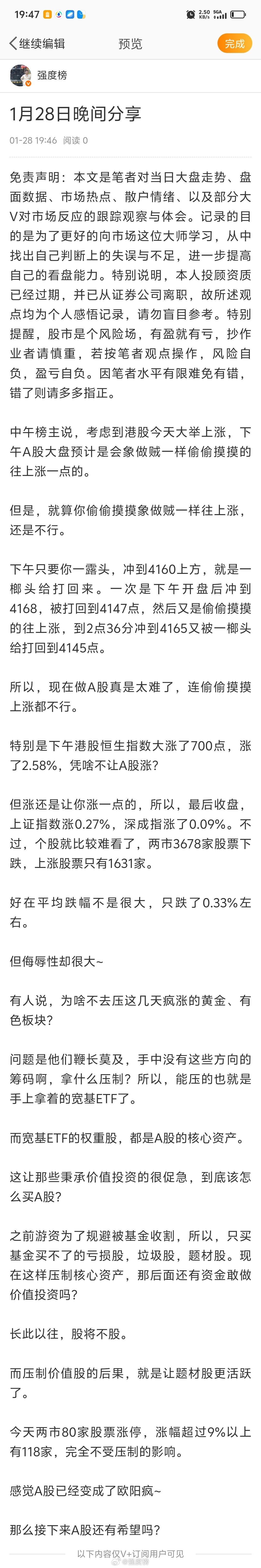 晚间分享 A股[超话] 1月28日晚间分享中午榜主说,考虑到港股今天大举上涨,下午A股大盘预计是会象做贼一样偷偷摸摸的往上涨一点的。但是,就算你偷偷摸摸象做贼一样往上涨,还是不行。下午只要你一露头,冲到4160上方,就是一榔头给打回来。一次是下午开盘后冲到4168,被打回到4147点,然后又是偷偷摸摸的往上涨,到2点36分冲到4165又被一榔头给打回到4145点。所以,现在做A股真是太难了,连偷偷摸摸上涨都不行。特别是下午港股恒生指数大涨了700点,涨了2.58%,凭啥不让A股涨?