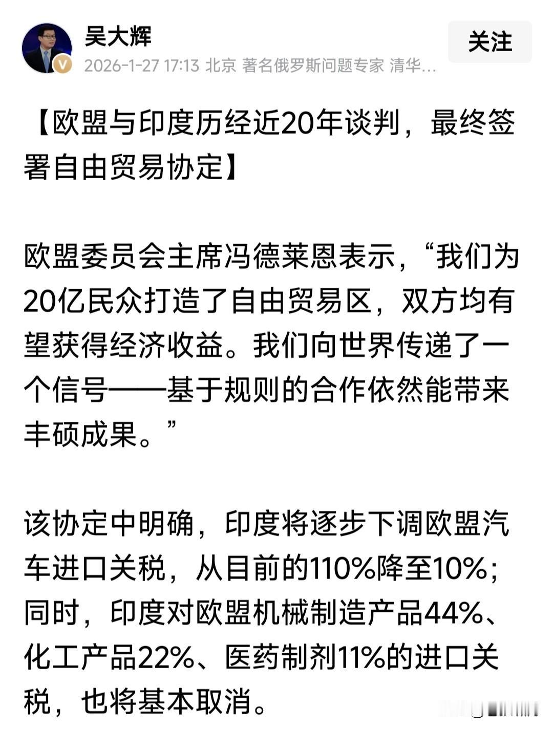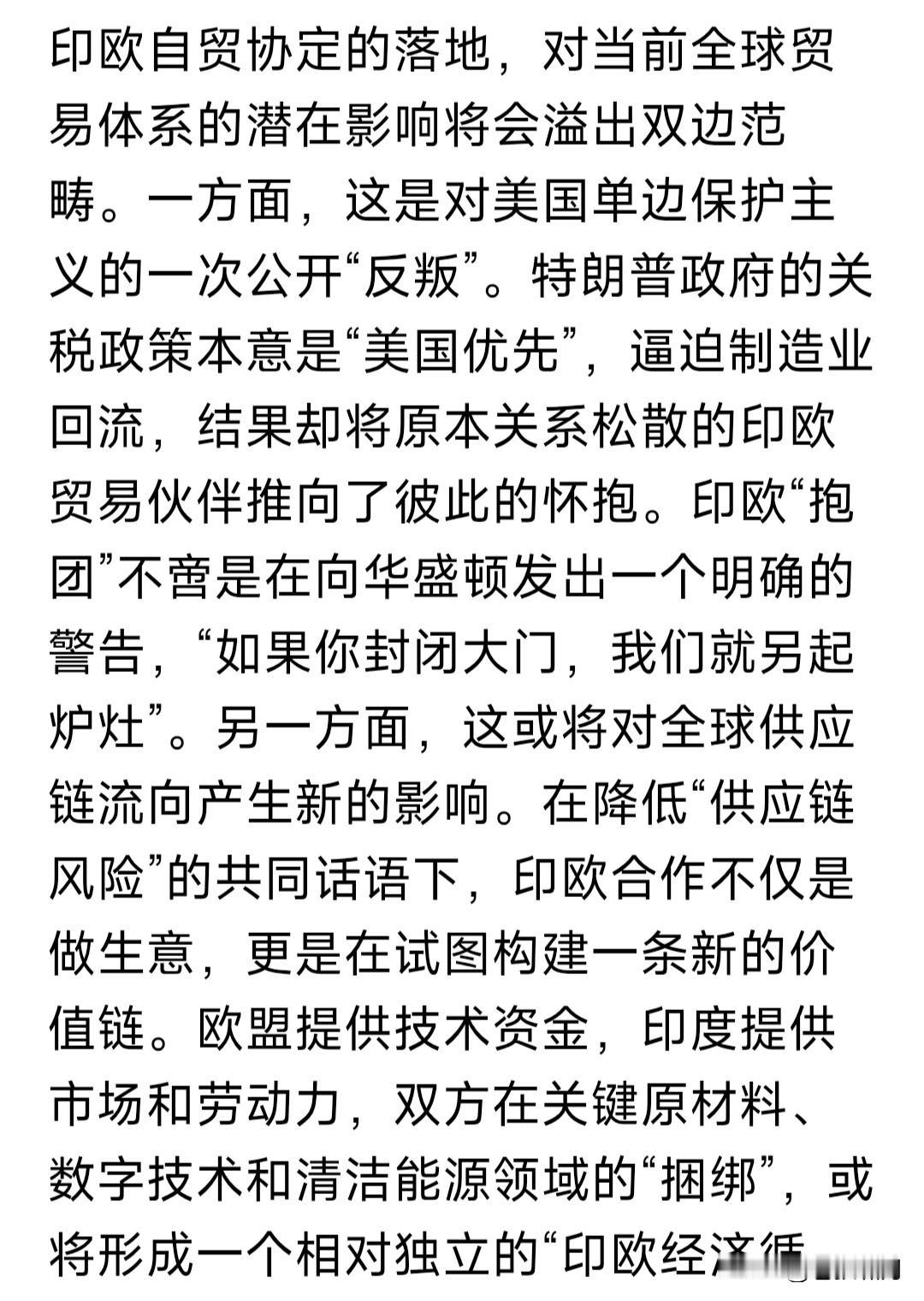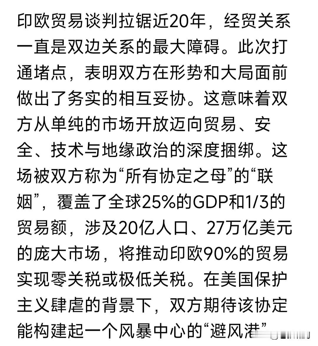 印欧签订“自贸协定”,20年谈判终于成“正果”!互相大幅下调关税,覆盖全球25%GDP,1/3贸易额,惠及20亿人,给双方经济注入新活力。 印欧“自贸协定”已谈20年,期间因美国不断从中作梗,谈谈停停进展艰难!为何突然之间宣布谈成了? 可能也是由于老美因素:川普二进白宫乱加关税,加剧世界经济的不确定性,欧印都受到伤害,急于寻找稳定贸易伙伴,一拍即合就成了吧! 我们祝贺印欧达成“自贸协议”!也对中欧“自贸协定”充满期待。中欧自贸与印欧一样,也谈了很久,一直没能结果,也是由于老美从中使坏! 老特二进白宫,对各国乱加关税,不仅扰乱贸易秩序,也使各国清醒过来!老美靠不住,川普“不靠谱”,要想稳定发展,要找最可靠的朋友! 当今世界各国,中美经贸规模最大!但最稳定的贸易伙伴,却是欧盟与东盟。中欧班列通行十多年,连接的就是中欧贸易。近期由于老美使坏,中欧贸易出现波折,但现在有转折。 最近法英两国领导人先后访华!韩国总统与加拿大总理来华访问,酝酿减税,签订合作项目!其他欧洲与澳新等国,都有与华搞好贸易意向! 这是一个好兆头!我们应该抓住时机,与这些国家展开贸易谈判,争取像印欧一样,达成“自贸协定”,对于中国经济发展,将起到助力作用! …………