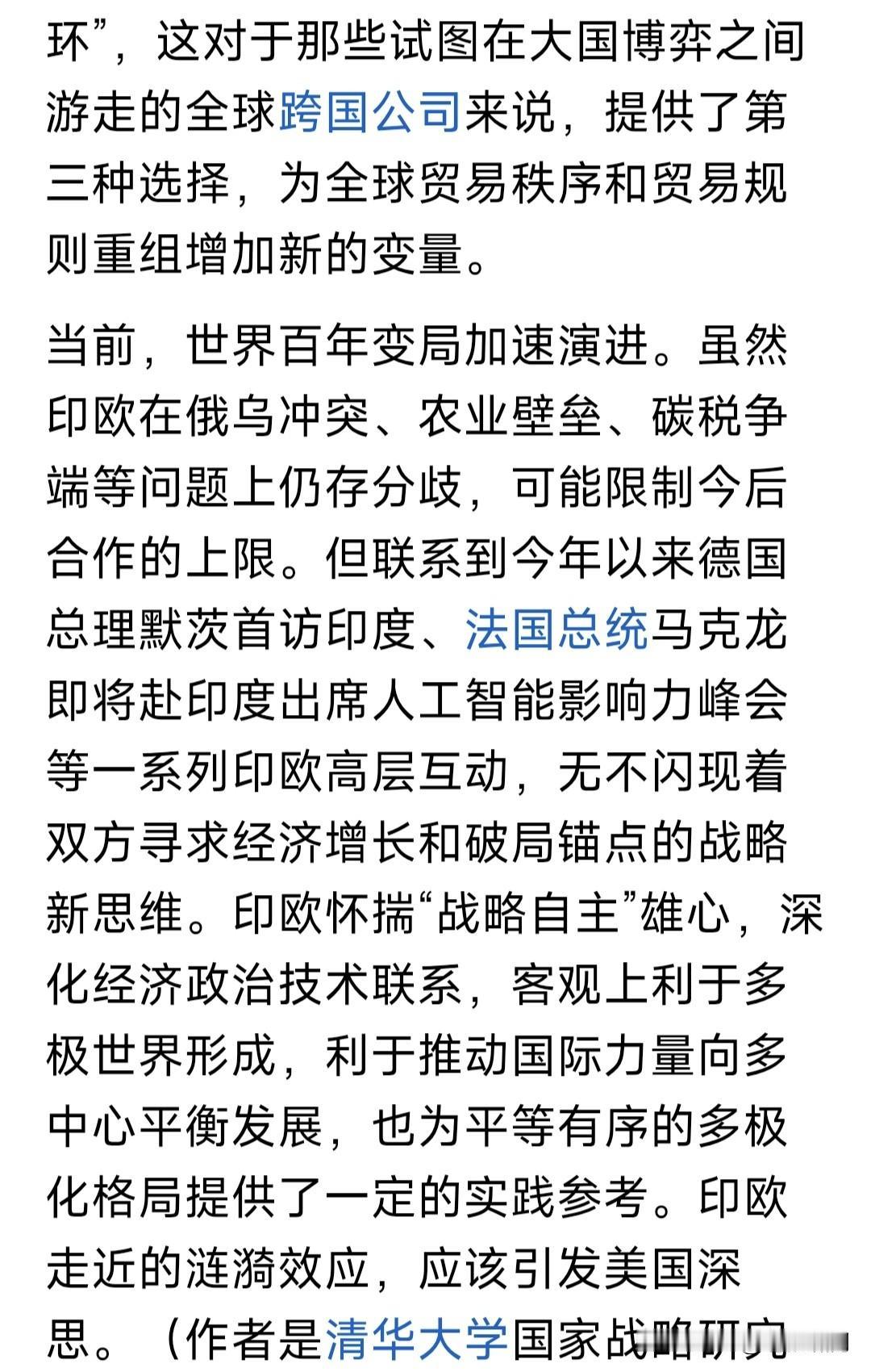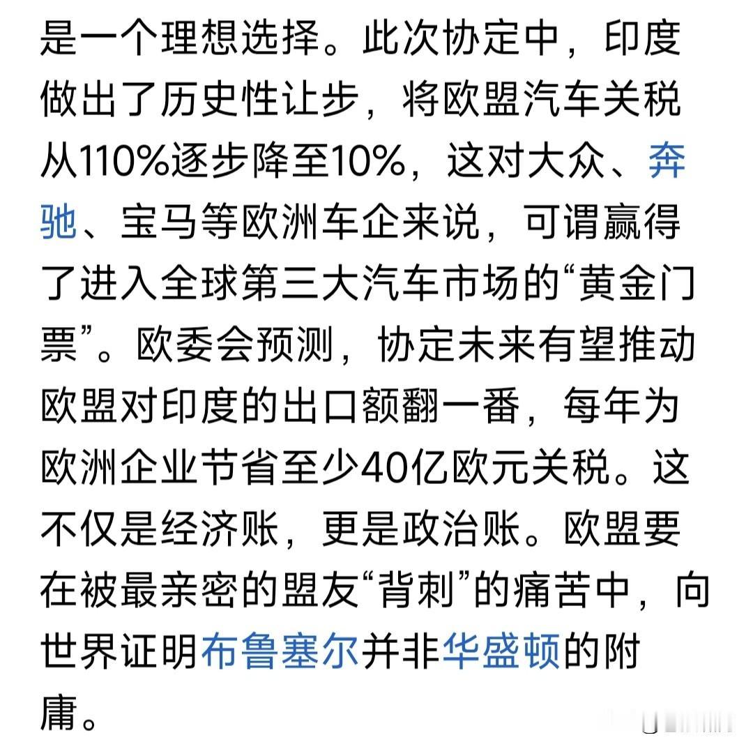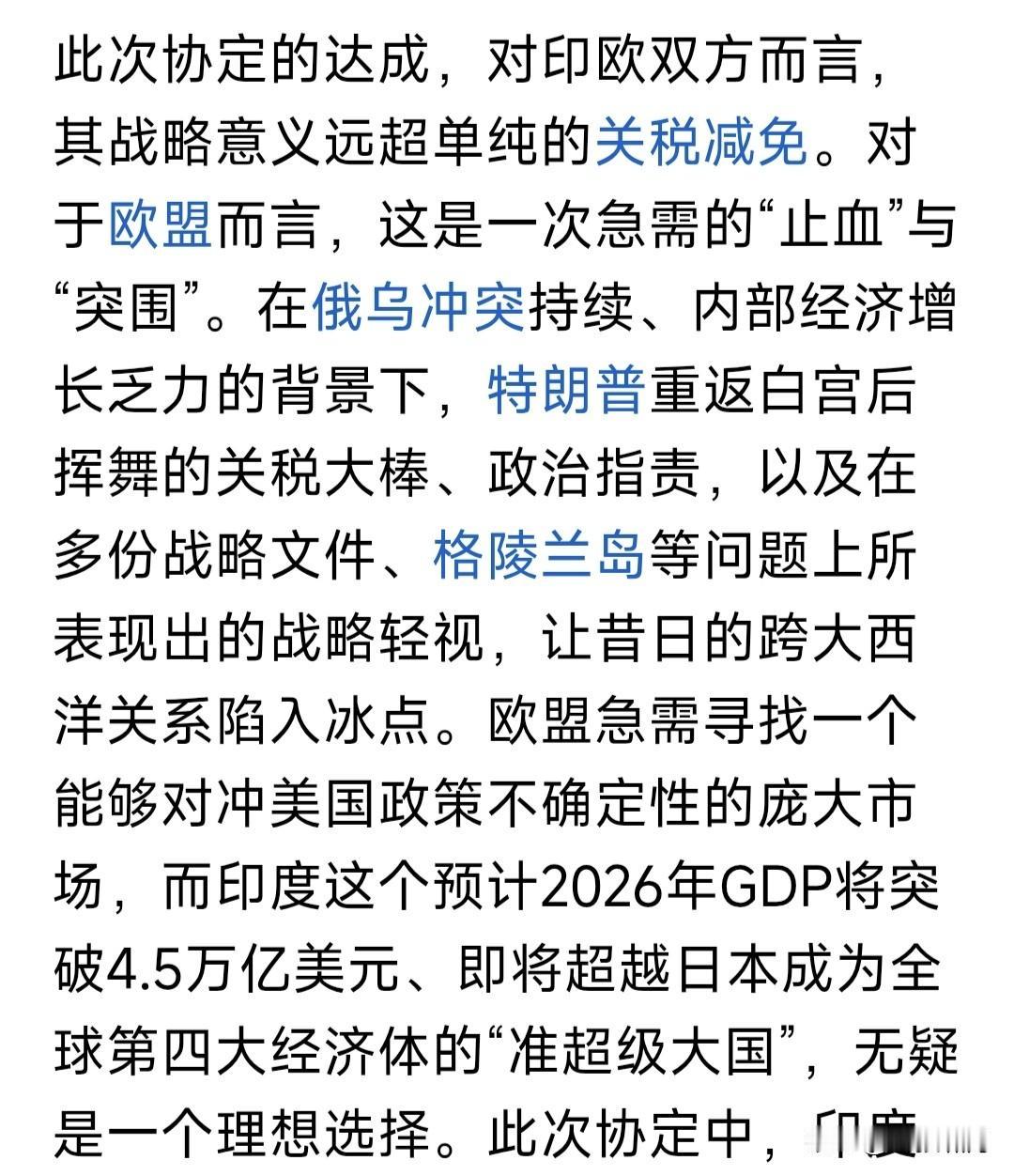 印欧签订“自贸协定”,20年谈判终于成“正果”!互相大幅下调关税,覆盖全球25%GDP,1/3贸易额,惠及20亿人,给双方经济注入新活力。 印欧“自贸协定”已谈20年,期间因美国不断从中作梗,谈谈停停进展艰难!为何突然之间宣布谈成了? 可能也是由于老美因素:川普二进白宫乱加关税,加剧世界经济的不确定性,欧印都受到伤害,急于寻找稳定贸易伙伴,一拍即合就成了吧! 我们祝贺印欧达成“自贸协议”!也对中欧“自贸协定”充满期待。中欧自贸与印欧一样,也谈了很久,一直没能结果,也是由于老美从中使坏! 老特二进白宫,对各国乱加关税,不仅扰乱贸易秩序,也使各国清醒过来!老美靠不住,川普“不靠谱”,要想稳定发展,要找最可靠的朋友! 当今世界各国,中美经贸规模最大!但最稳定的贸易伙伴,却是欧盟与东盟。中欧班列通行十多年,连接的就是中欧贸易。近期由于老美使坏,中欧贸易出现波折,但现在有转折。 最近法英两国领导人先后访华!韩国总统与加拿大总理来华访问,酝酿减税,签订合作项目!其他欧洲与澳新等国,都有与华搞好贸易意向! 这是一个好兆头!我们应该抓住时机,与这些国家展开贸易谈判,争取像印欧一样,达成“自贸协定”,对于中国经济发展,将起到助力作用! …………
