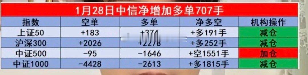 1.28周三晚间 中信继续减仓,机构大幅加仓!最新期指数据来了!中信净增加多单707手机构净增加空单6452手中信继续减仓,机构逆势大幅加仓!今天大盘、小盘继续分化,从数据看某队还是在继续大幅减仓,控制好仓位。大小盘股继续维持分化,呈现指数不跌,个股跌。不作为投资买卖建议,仅供参考股票