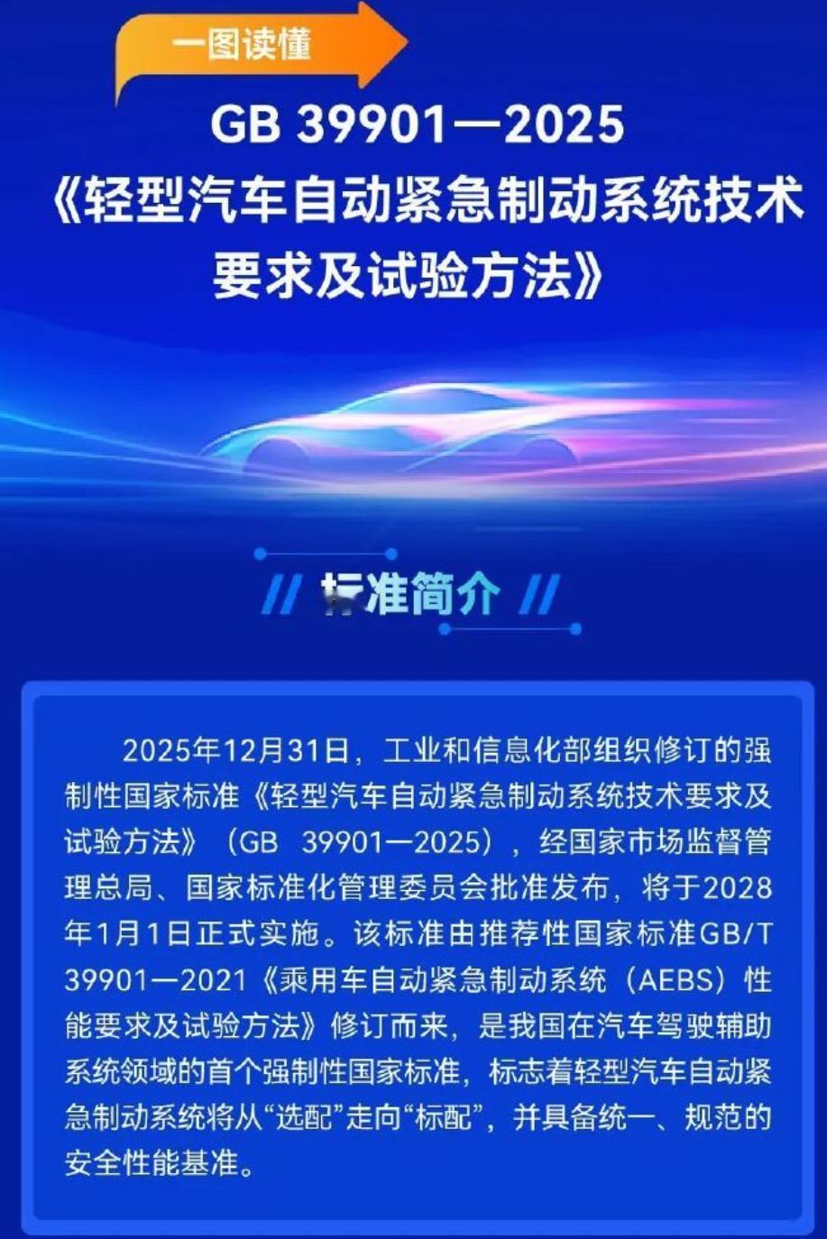 辅助驾驶安全要求继续加强。 最近一年来,国家对辅助驾驶的安全性要求越来越高。 如今又发布了首个强制性国家标准,将我们常说的主动安全功能:自动紧急制动系统(AEB),从选配变成了标配。 这个要求对很多车企会带来很大影响,特别是售价低的车型,增加提高系统,成本压力要增加不少。 好在是最晚要求2030年开始执行,给大家留的时间还多。