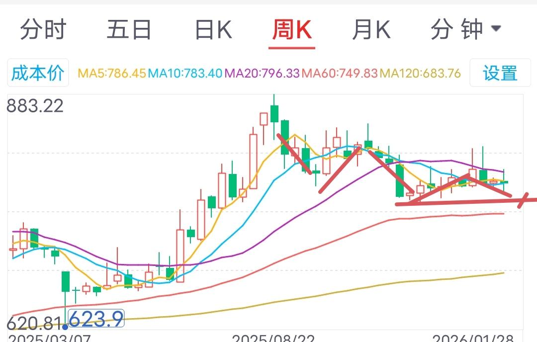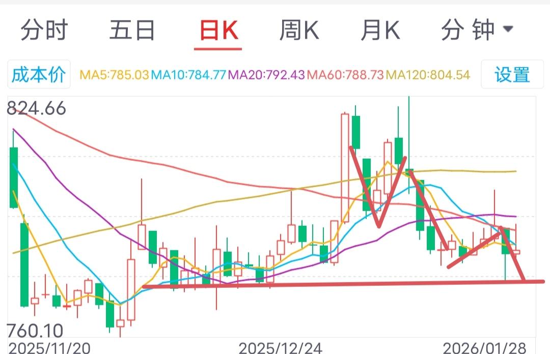 1月29日周四券商板块走势预测 今日,券商板块开盘报781.89点,最低探至781.28点,最高涨至790.29点,最终收于783.28点,微涨0.14%,量能相较周三略有放大。 60分钟级别上,昨日短暂跌破前期低点779后最终回升,今日走势冲高回落,回踩确认,最低至781处获得支撑。 日线级别当前处于5浪调整阶段,旨在回踩确认低点的有效性。 周线级别同样可视为5浪调整,接下来或继续调整,有望在到达760后获得支撑,形成小双底,而后向上突破。 综合分析,明日券商板块将先向下调整,在779点获得支撑后,继续上行,形成头肩底形态,第一目标位为791点。