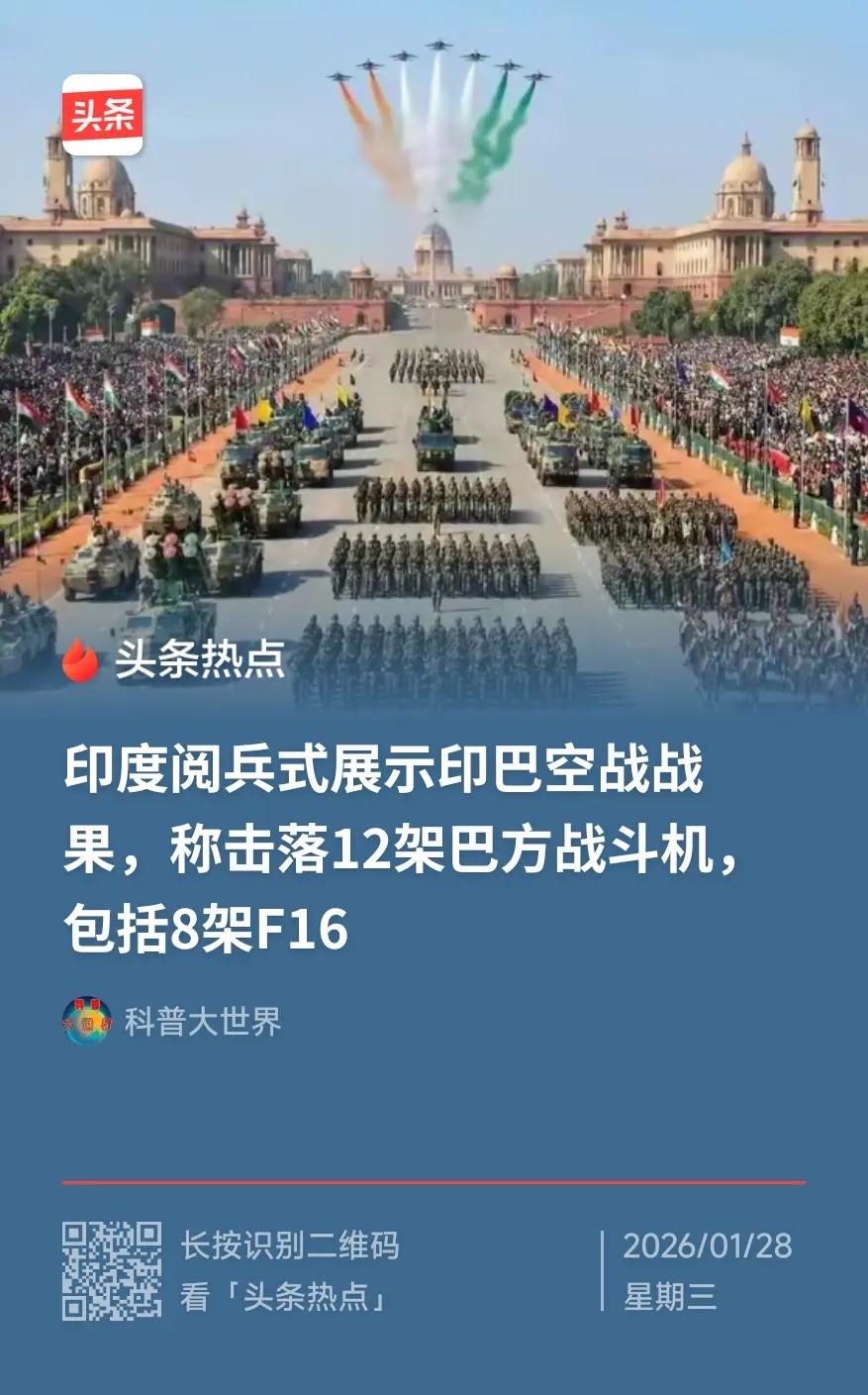印度称在印巴空战中击落12架巴方战机,其中包括8架F-16战斗机,这牛皮吹的,美国洛克希德·马丁公司要一口老血喷三尺高! 印度阅兵式要是这样展示,称击落了8架F-16战斗机,按说最应该坐不住的是美国,F-16战机还怎么在大卖? 现在F-16战机依然是抢手货,连二手的F-16战机,对于正在炮火连天的乌克兰那都是抢手货!