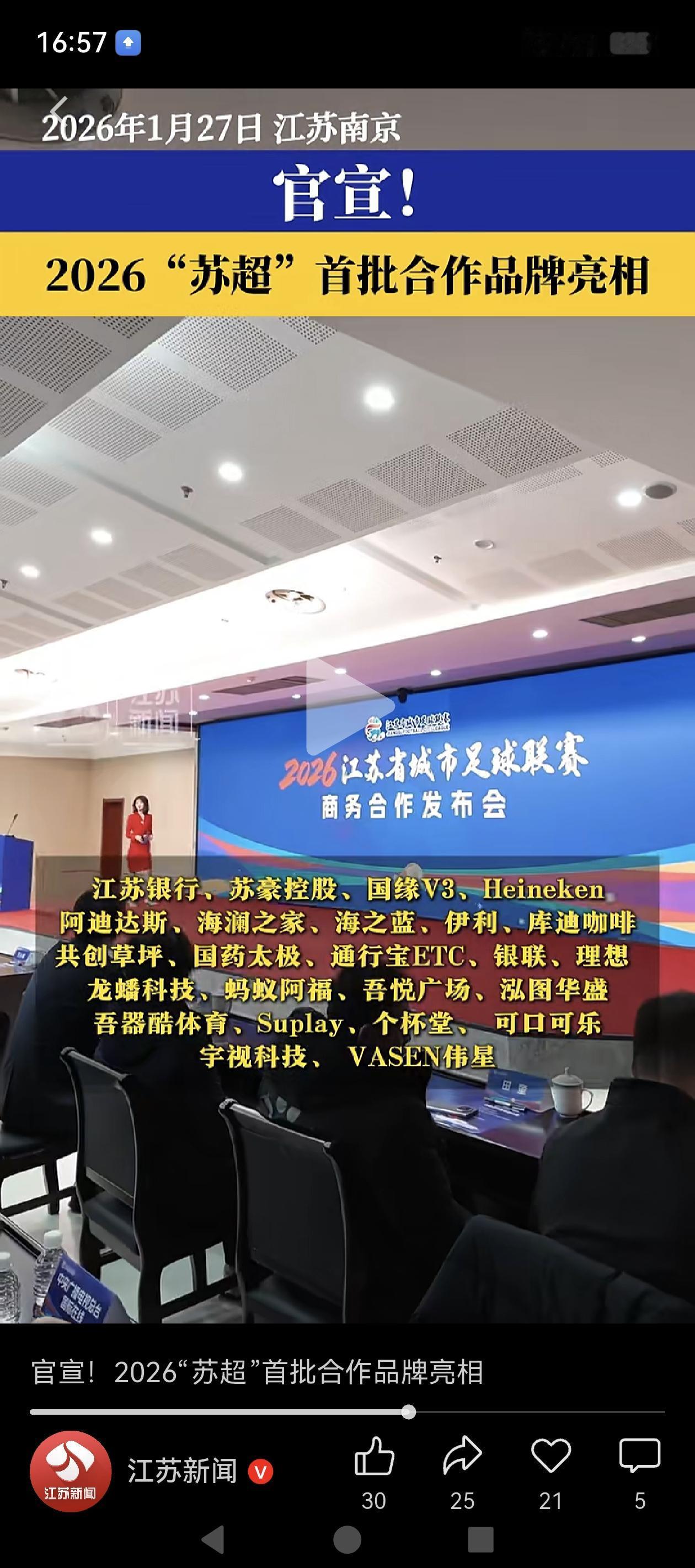昨天,江苏省体育局公布了2026年苏超首批24家合作品牌,这里不乏国际大品牌,覆
