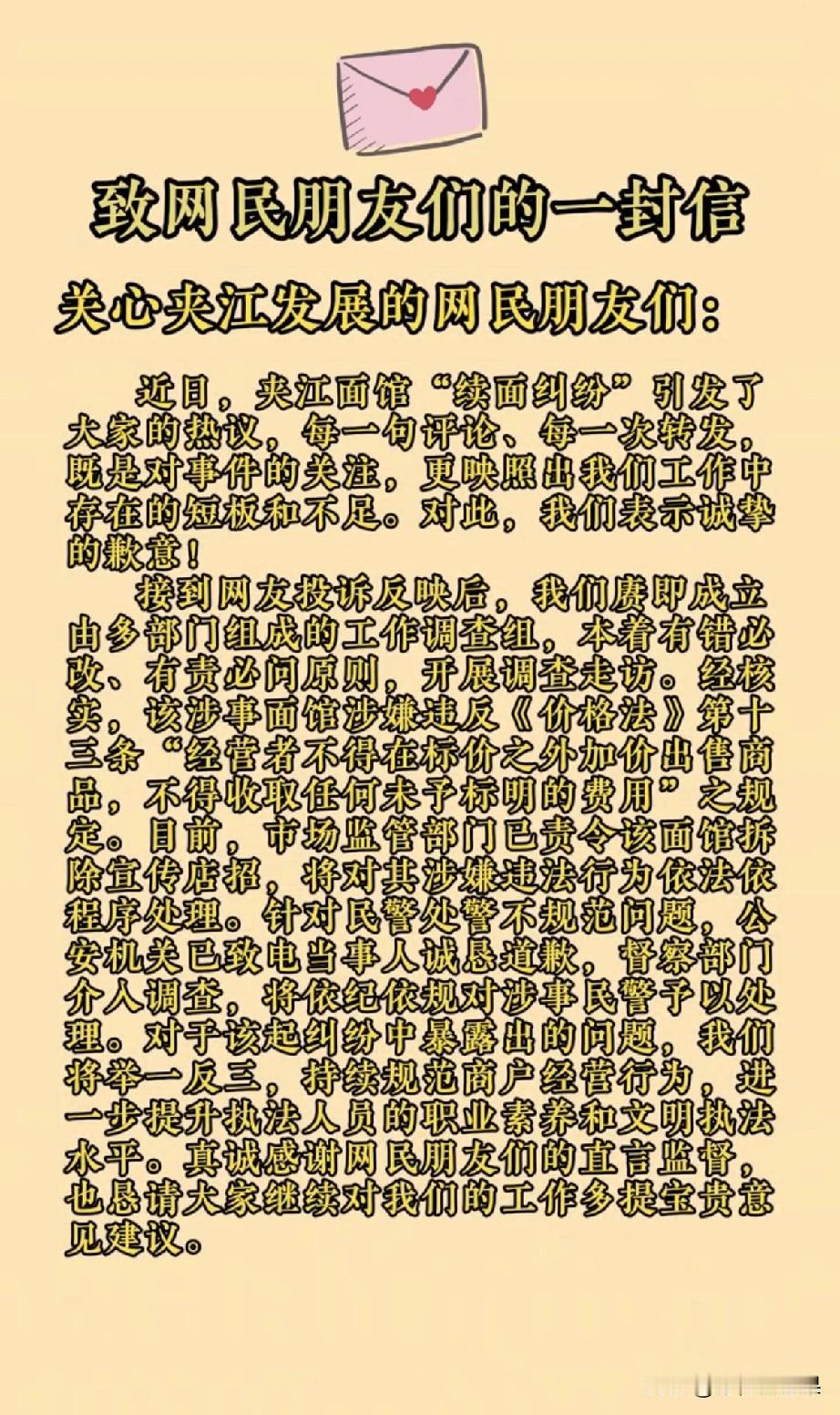 最近闹得沸沸扬扬的“3元续面”事件最新通告出来了! 辽宁来的邢大哥在四川夹江吃面,看到店门口写着“免费加面”,就放心吃了一碗。第一次续面没花钱,正准备续第二碗时,老板突然变脸:“再加要收3块!” 邢大哥当时就懵了:“你这不是写了免费吗?”老板说“免费”是限一次,第二次要加钱,争执不下,老板直接把他的面碗收走了。 邢大哥气不过报了警,没想到出警的民警来了句灵魂拷问:“3块钱你都不愿意出?还不够我油钱呢!”这话一出来,全网直接炸锅了。 好在夹江官方反应够快,马上成立调查组,给了个明明白白的结果: - 涉事面馆被认定虚假宣传,违反了价格法,已经被要求把骗人的招牌拆了,后面还要依法处罚。 ​ - 说话不当的民警也被督察部门处理了,警方已经给邢大哥道了歉,后续会按规定处理。 更绝的是,官方还写了一封公开信,没有官话套话,直接认错、整改,还宣布春节期间夹江所有景区免费开放,这波操作直接把危机变成了圈粉现场。 不得不说,夹江这波公关真的满分!也给所有商家和部门提了个醒:做生意要讲诚信,执法要讲规范,守住底线才能留住人心。
