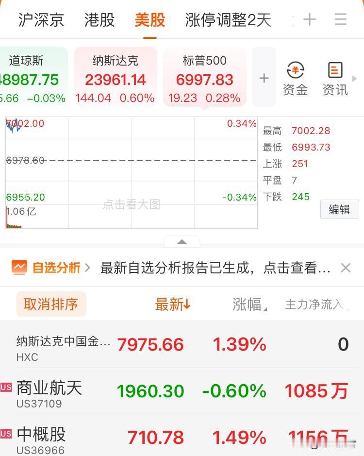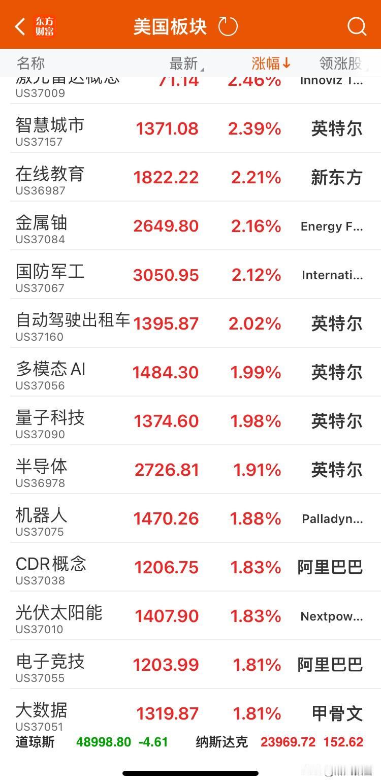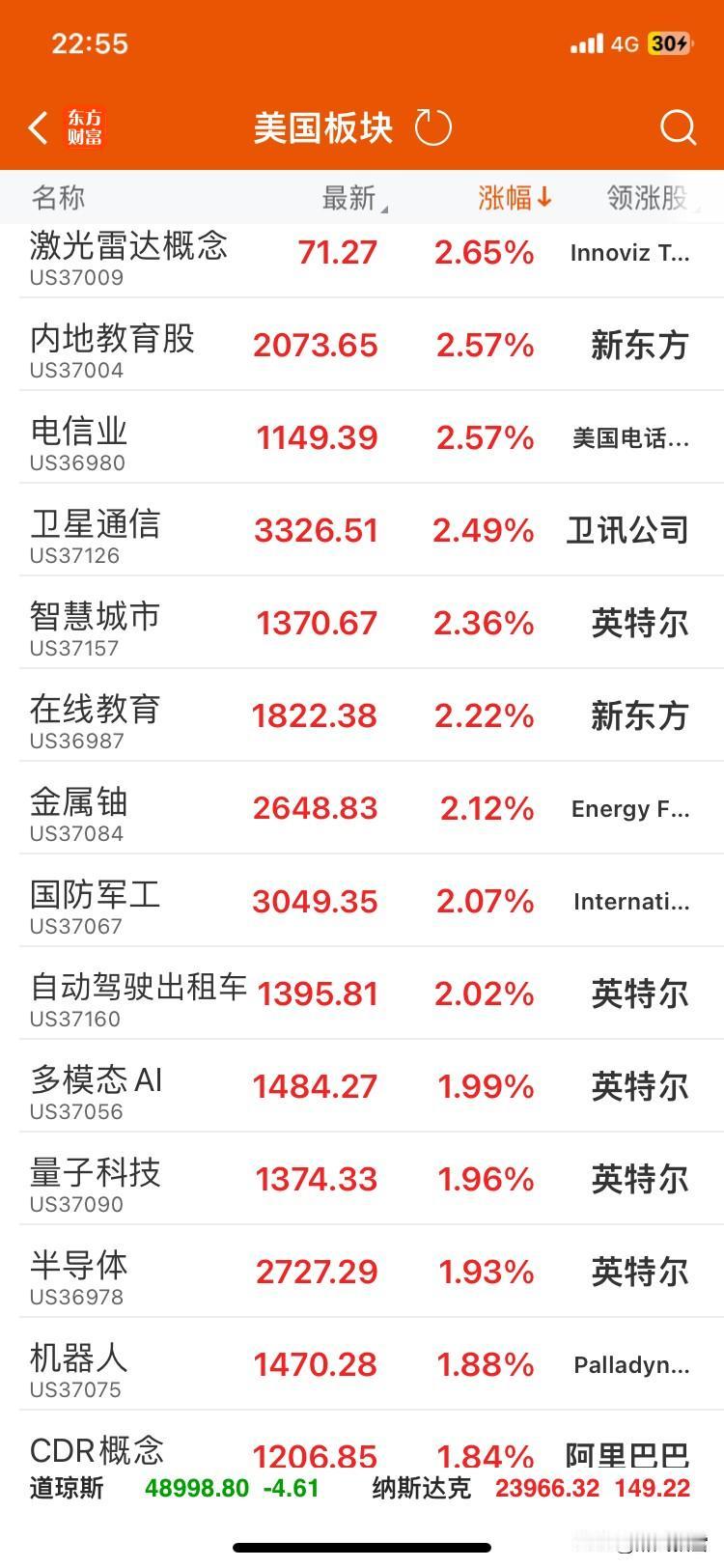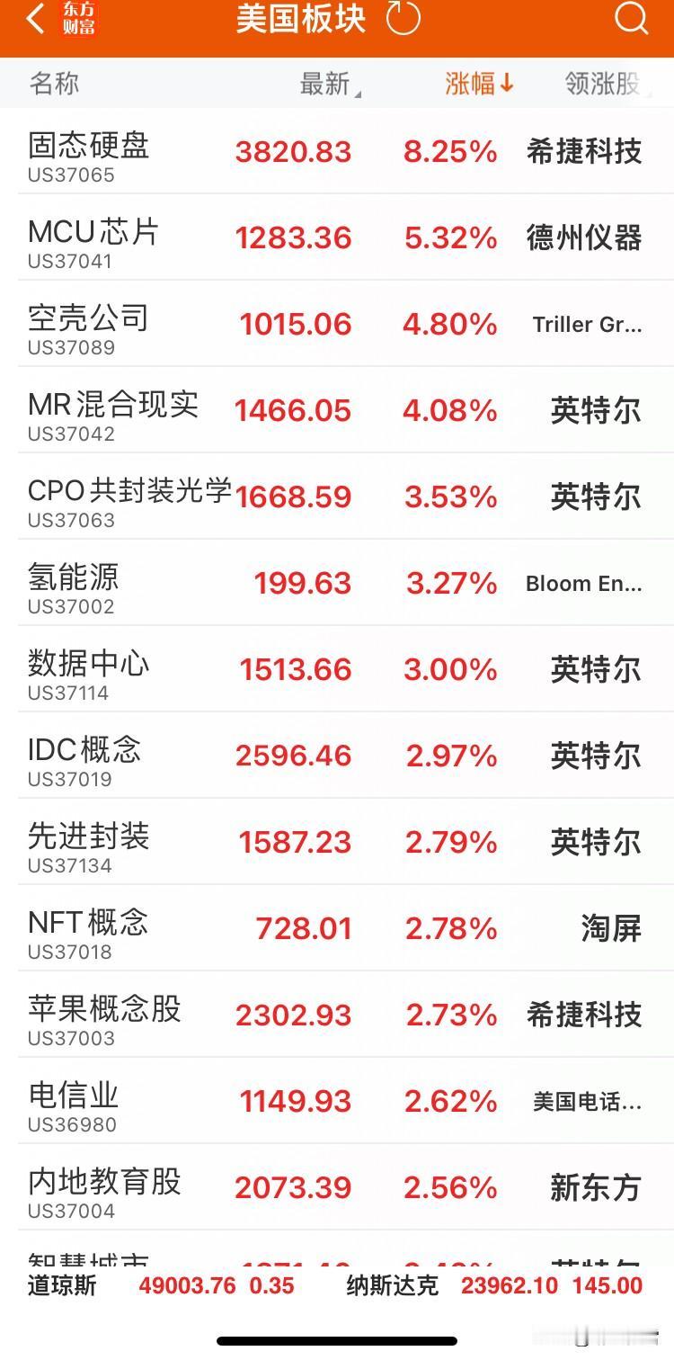 美市开盘 开盘半小时数据。 纳指→科技延续强势。 美股三大指数分化,道指微跌0.03%,纳指涨0.60%,标普500涨0.28%。 科技方向领涨,固态硬盘→存储芯片、MCU芯片板块分别大涨8.25%、5.32%,CPO →封装芯片、数据中心、机器人等算力相关板块同步走高。中概股指数涨1.49%,教育股表现亮眼,卫星通讯走强!