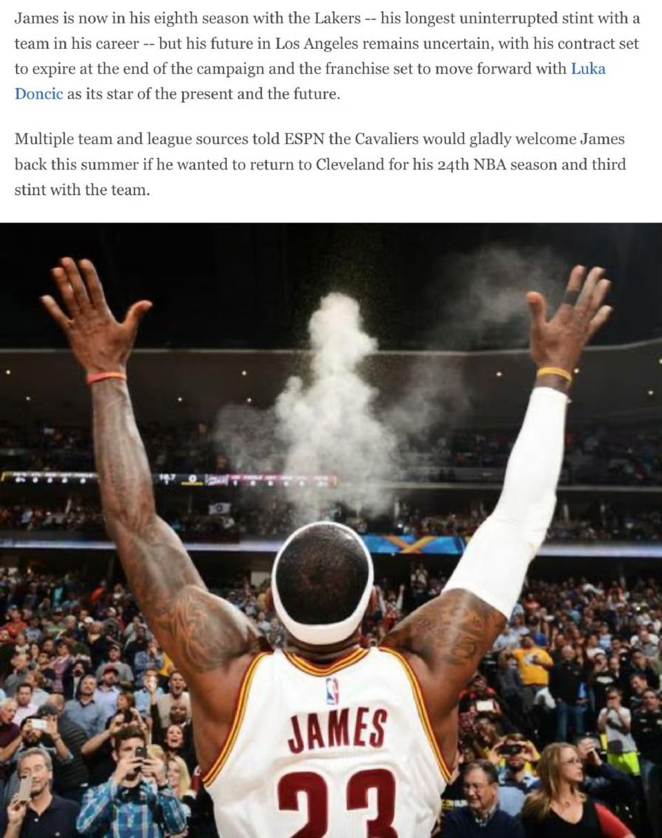 据ESPN湖人跟队记者Dave McMenamin报道: 据多位球队和联盟消息人士透露,如果詹姆斯想在今年夏天回到克利夫兰,开启自己的第24个NBA赛季,也是他第三次为骑士队效力,骑士队会非常乐意欢迎他回来。 詹姆斯现在已经在湖人打了第8个赛季,这是他职业生涯里在同一支球队待得最久的时间。不过他在洛杉矶的未来还不确定,因为他的合同将在本赛季结束后到期,而且球队已经明确要把东契奇当作现在和未来的核心球星来培养。詹姆斯 nba 湖人