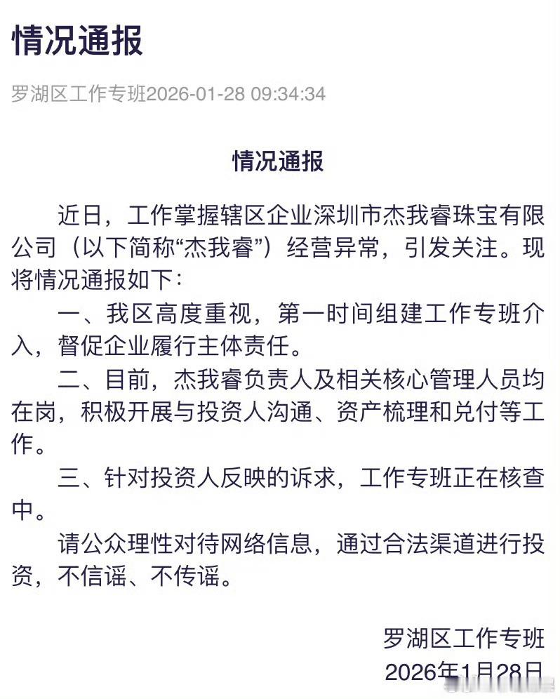 杰我睿被曝经营异常深圳通报1月28日,罗湖区工作专班发布情况通报:近日,工作掌握辖区企业深圳市杰我睿珠宝有限公司(以下简称“杰我睿”)经营异常,引发关注。现将情况通报如下:(见图片)现在明确了,负责人和核心管理人还在,没有跑路。 杰我睿负责人及核心管理均在岗