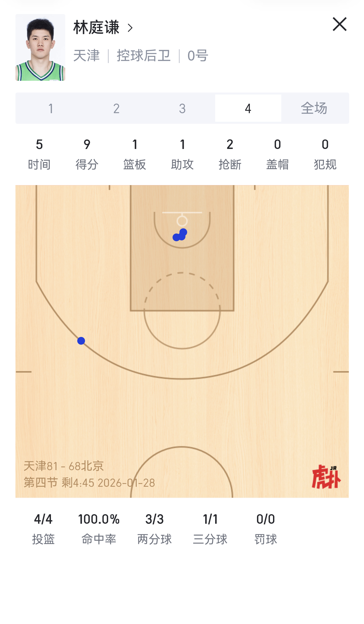 虽然是小概率事件,但是第四节你给林庭谦这样的后卫投开的话,你能怎么防他?守联防要被他投死,守盯人他单打能力又强。他一直得分,比分一直追不上,感觉这场首钢队机会不多了天津男篮vs北京男篮