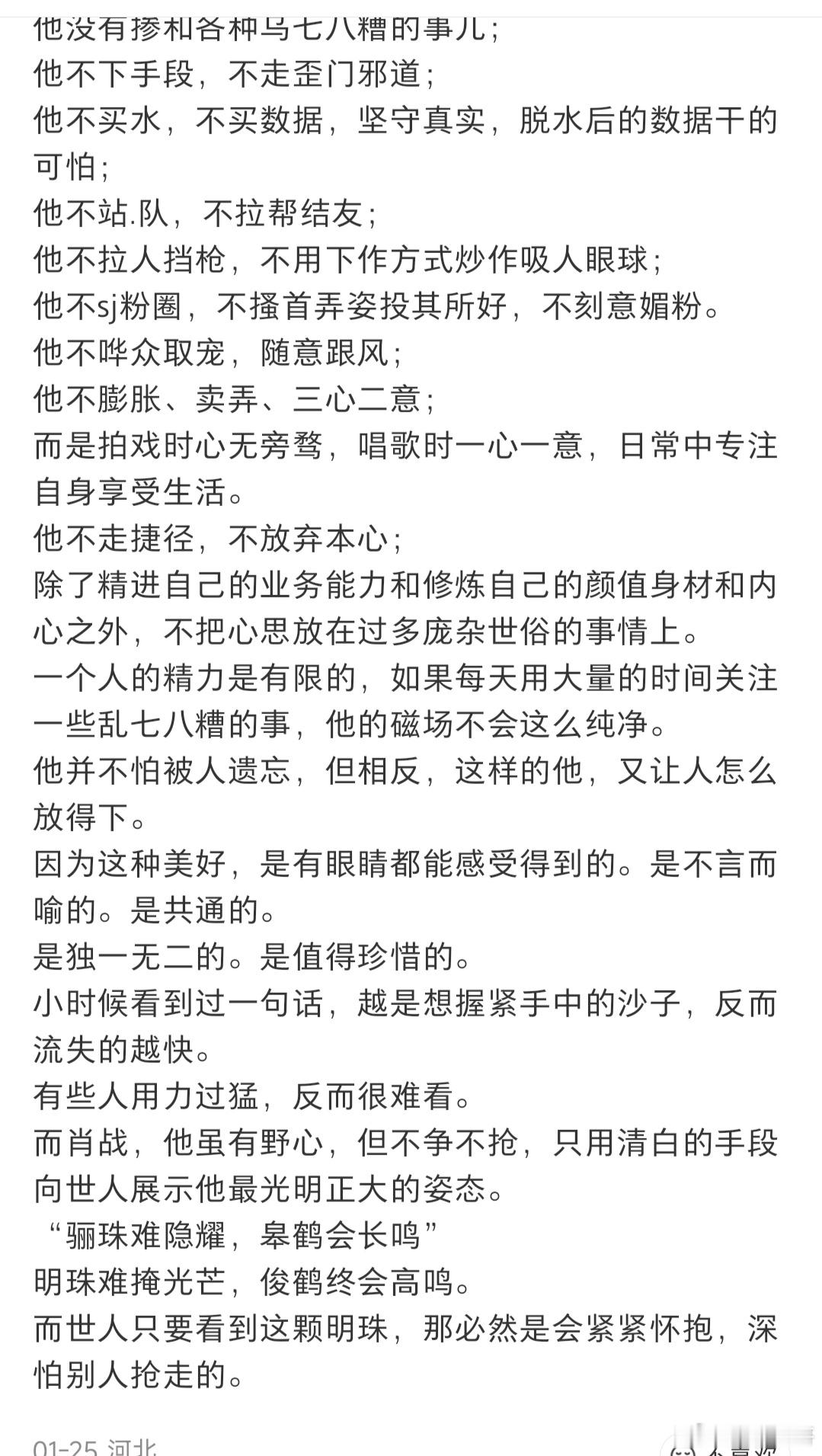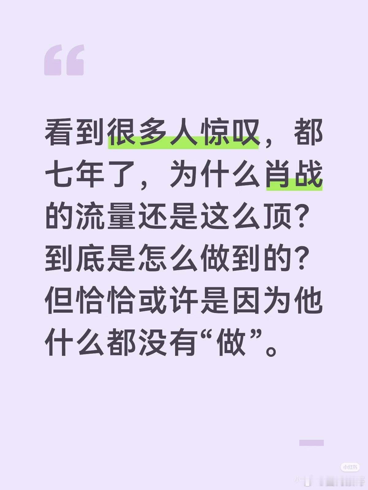 xhs上刷到一个关于肖战为什么爆了七年为什么依旧那么顶的帖子:恰恰是因为他什么都没有“做”!不拉帮结派、不sj粉圈、不膨胀、不卖弄、不拉人挡枪、不走捷径不三心二意等等。太过于独一无二的巨星了!