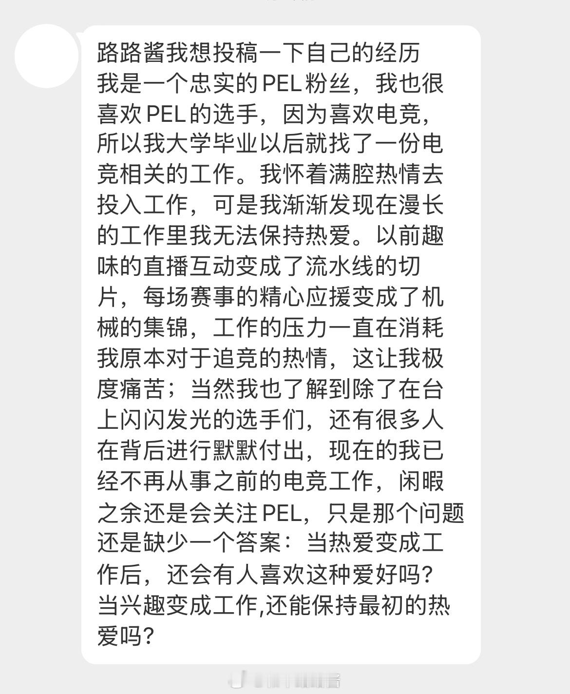 路路酱的树洞 路路酱的树洞第二期上线了今天投稿的小伙伴有这样的困惑当热爱变成工作后,你还能坚持这份爱好吗?当兴趣变成工作,你还能保持最初的热爱吗?大家是怎么看待这些问题的呢?在评论区留下你的观点 我们一起来畅所欲言吧2026pel 和平精英职业联赛