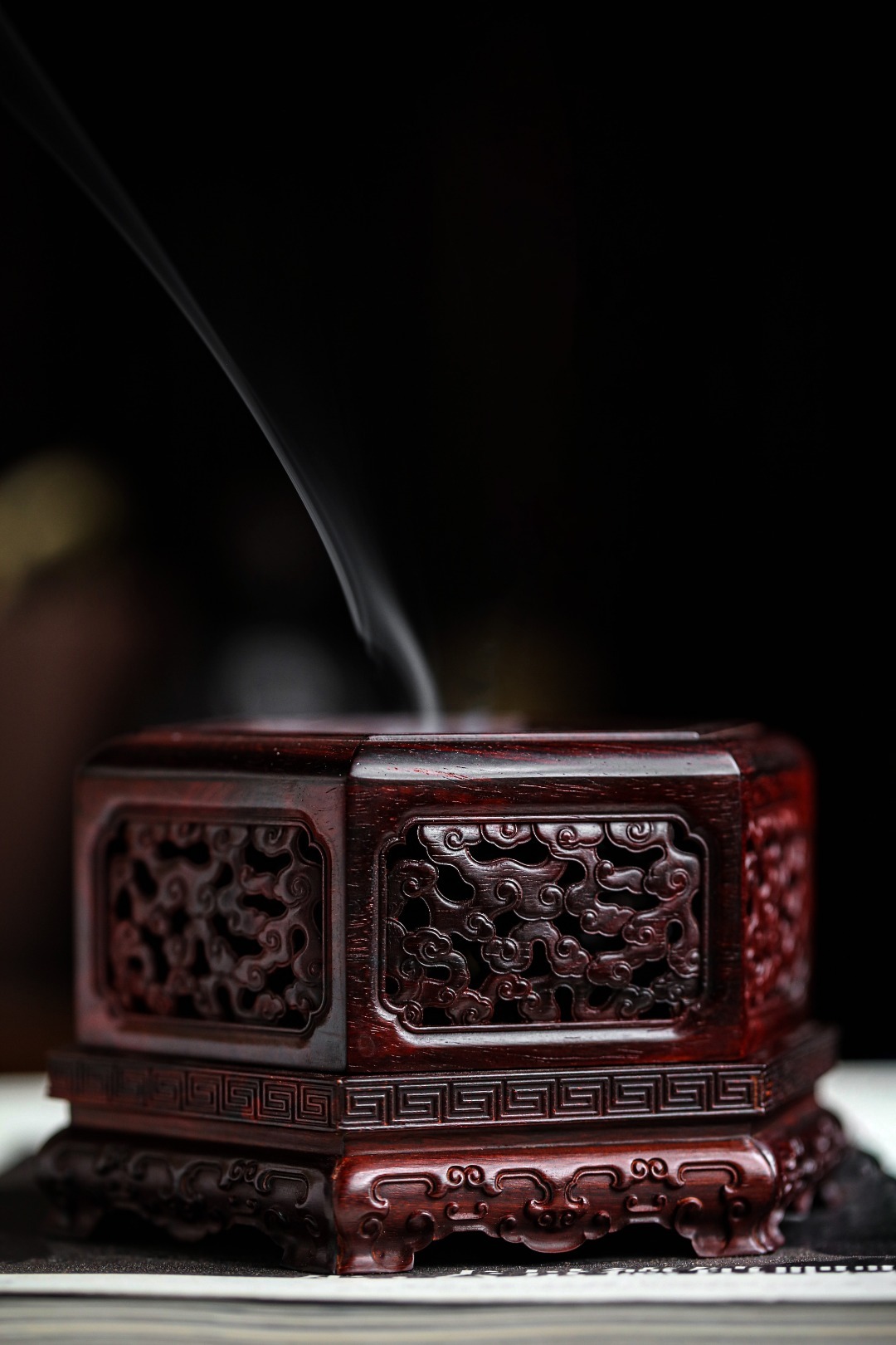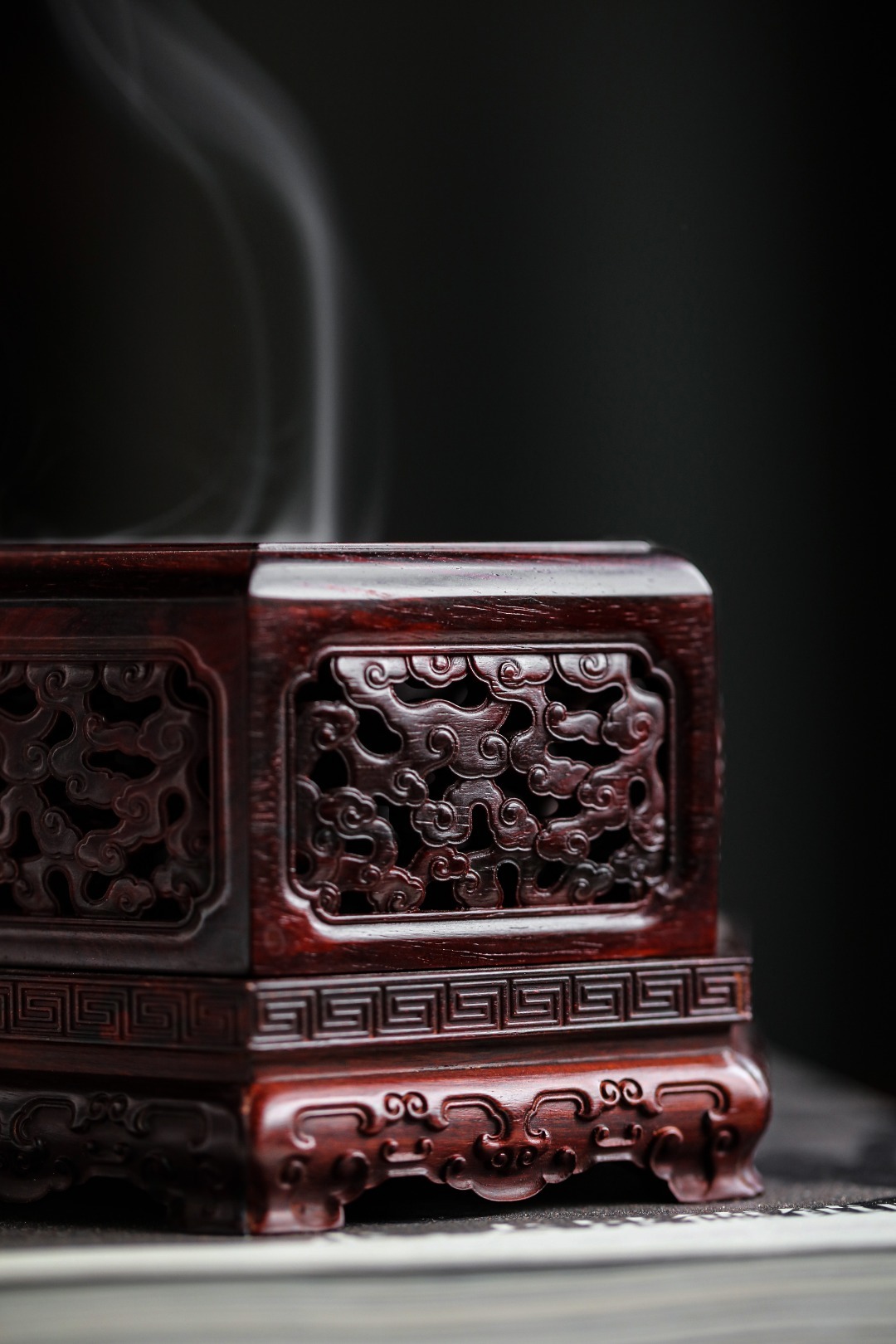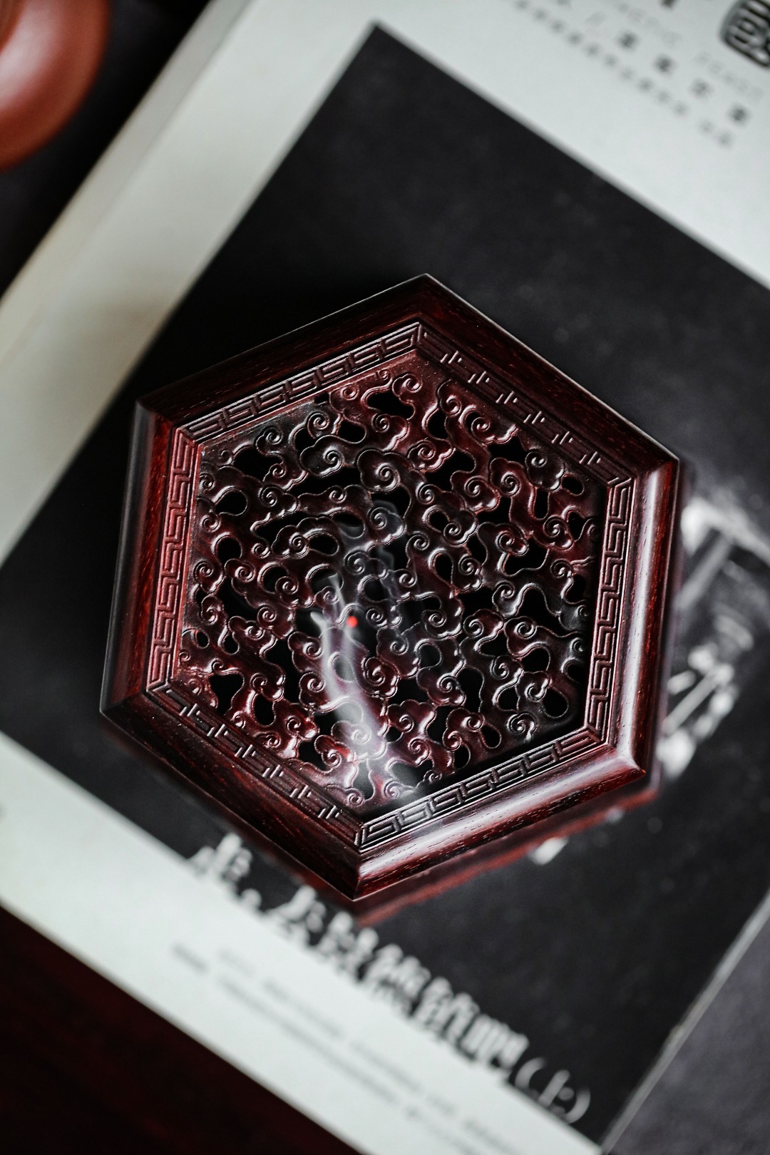 紫檀『六角祥云·盘香炉』香盒周身镂空雕刻祥云纹,层层叠叠,祥云漫天,烟香从壁孔袅袅而出,氤氲朦胧似仙境。摆放文房案头,古韵古香。12.8cm 高8.2cm 重313g