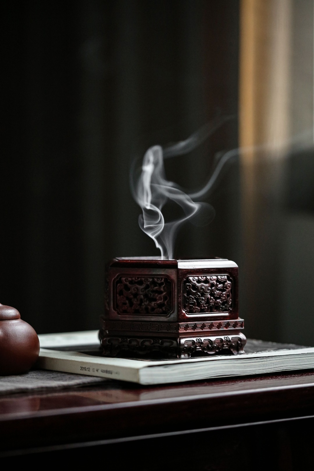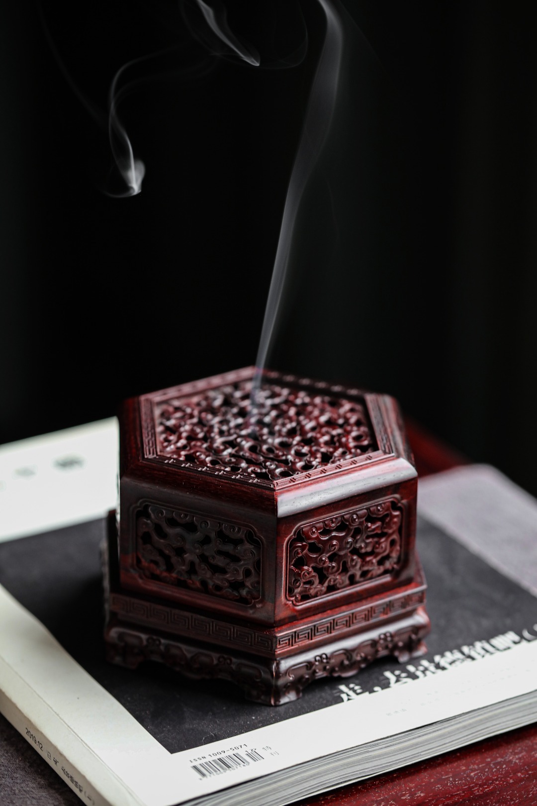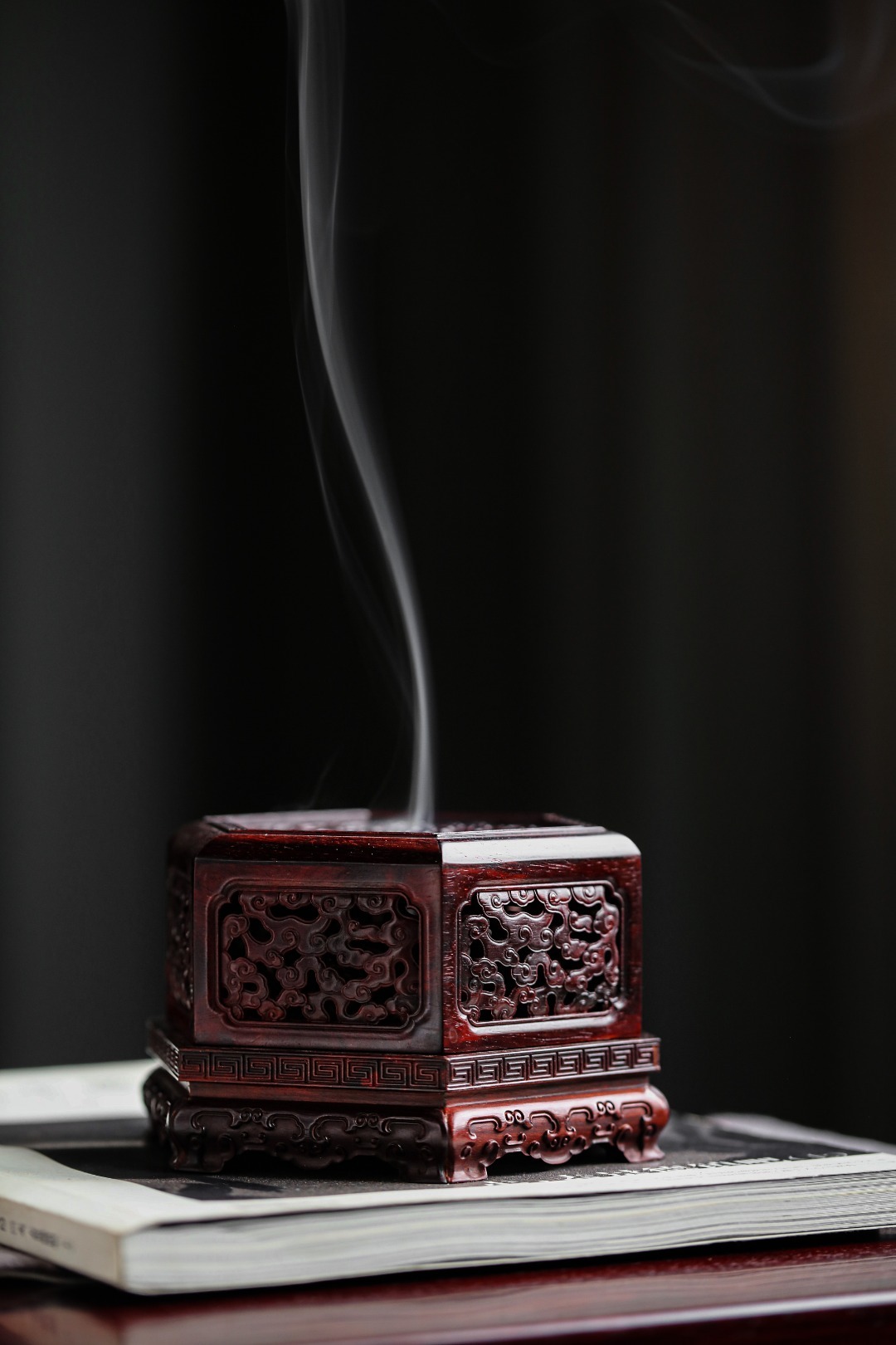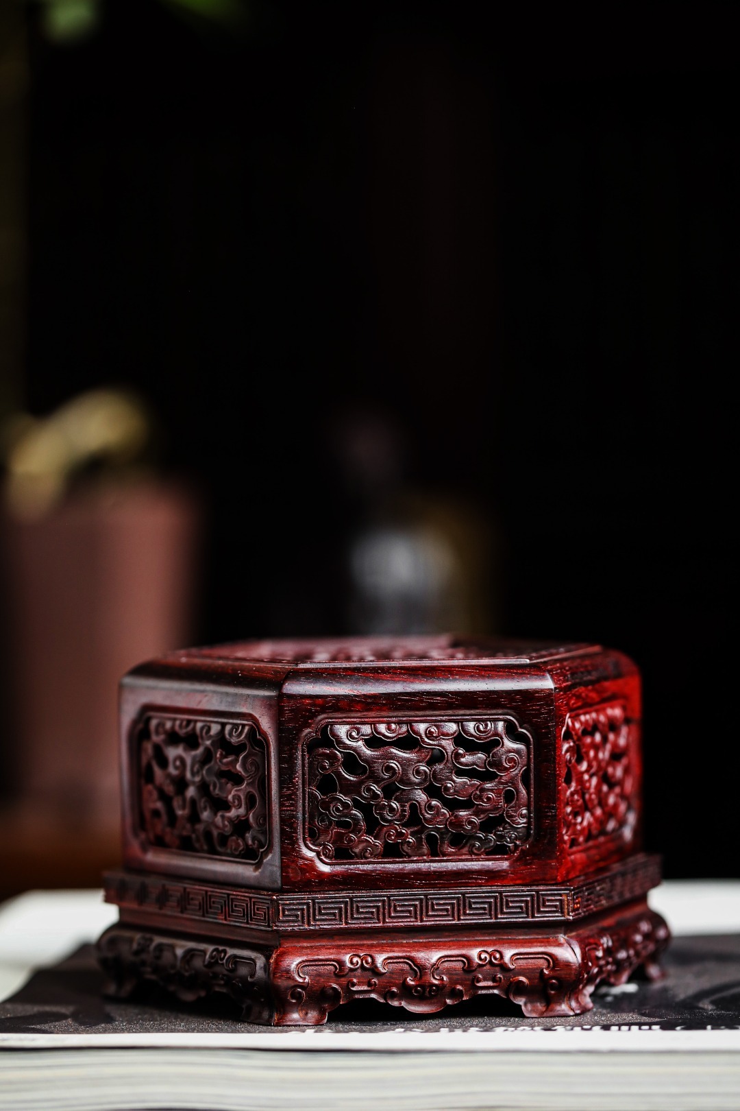 紫檀『六角祥云·盘香炉』香盒周身镂空雕刻祥云纹,层层叠叠,祥云漫天,烟香从壁孔袅袅而出,氤氲朦胧似仙境。摆放文房案头,古韵古香。12.8cm 高8.2cm 重313g