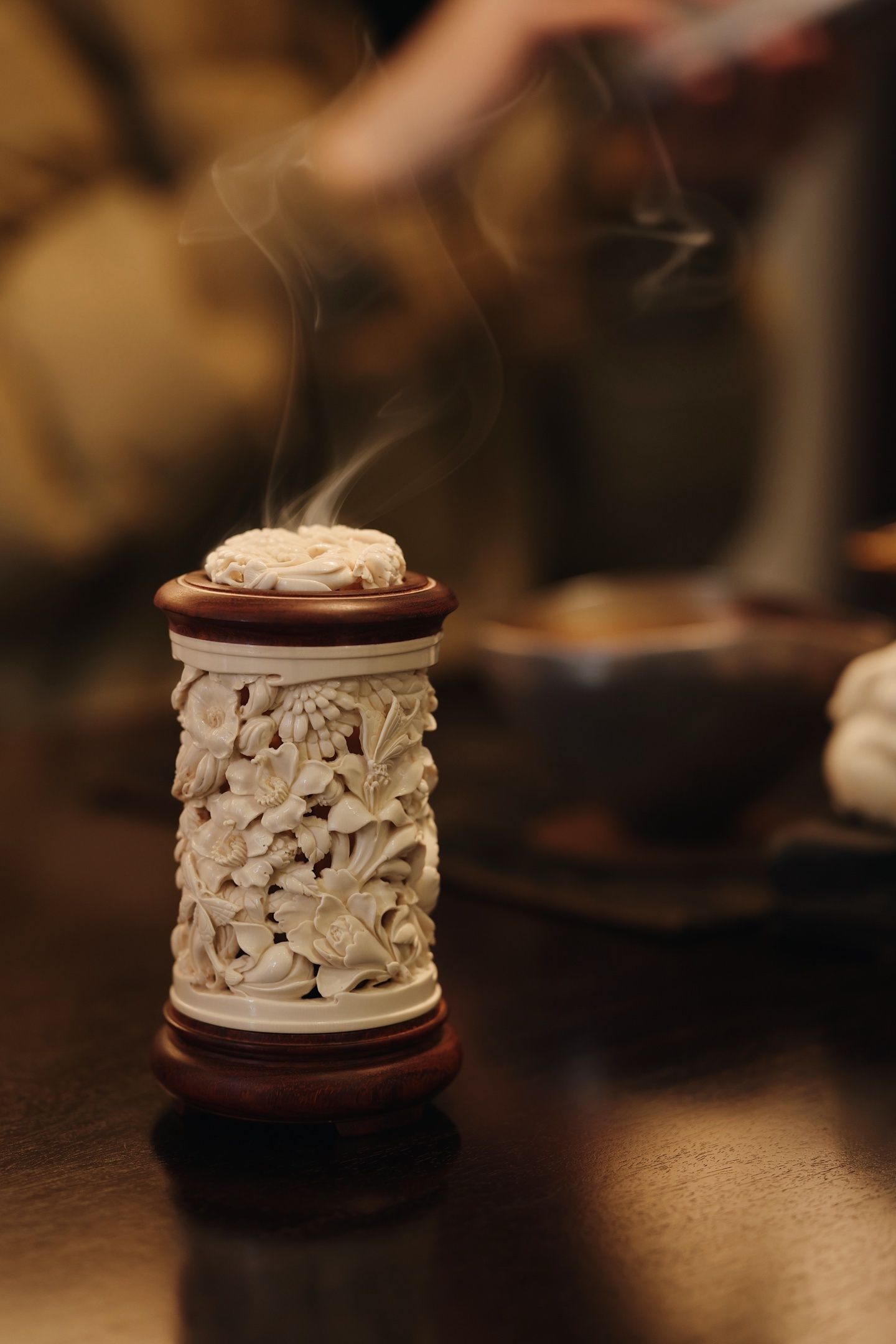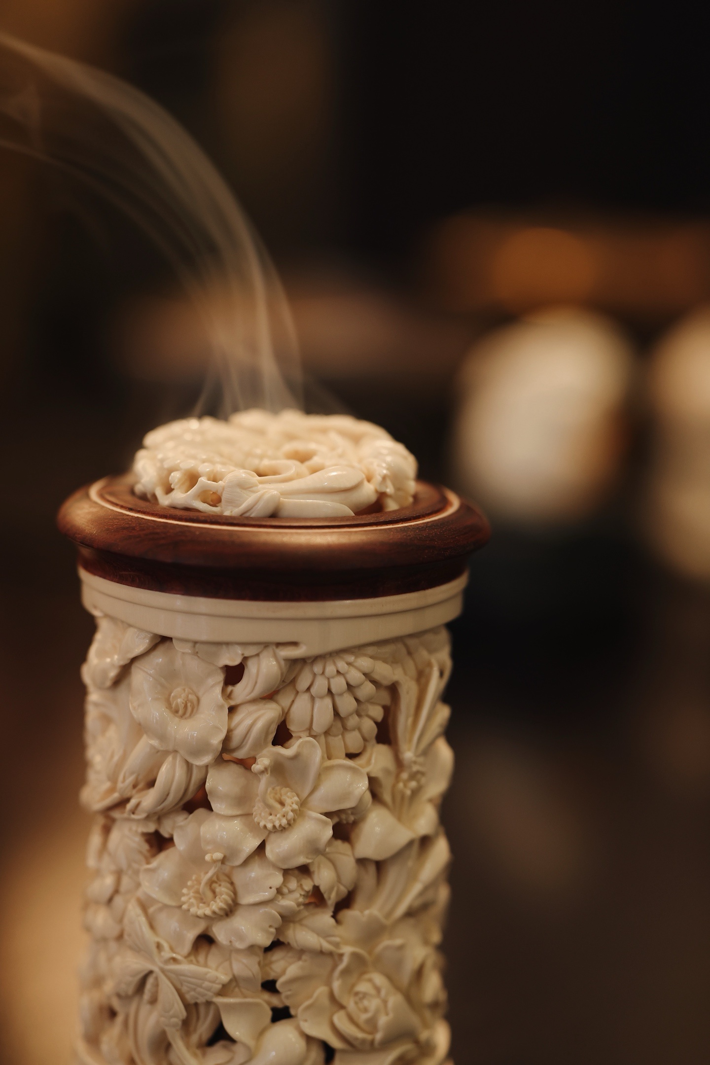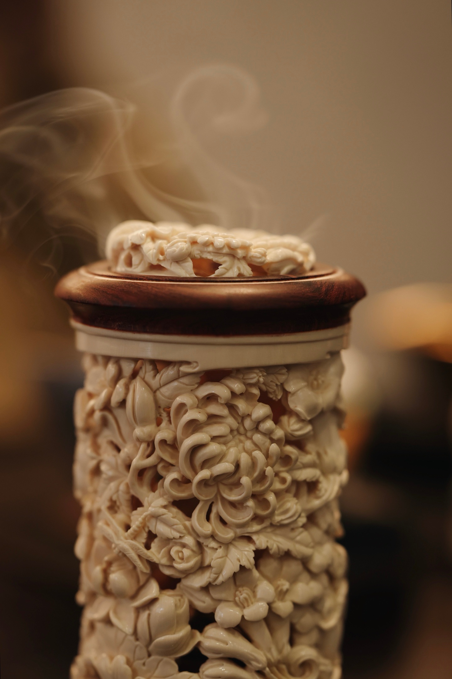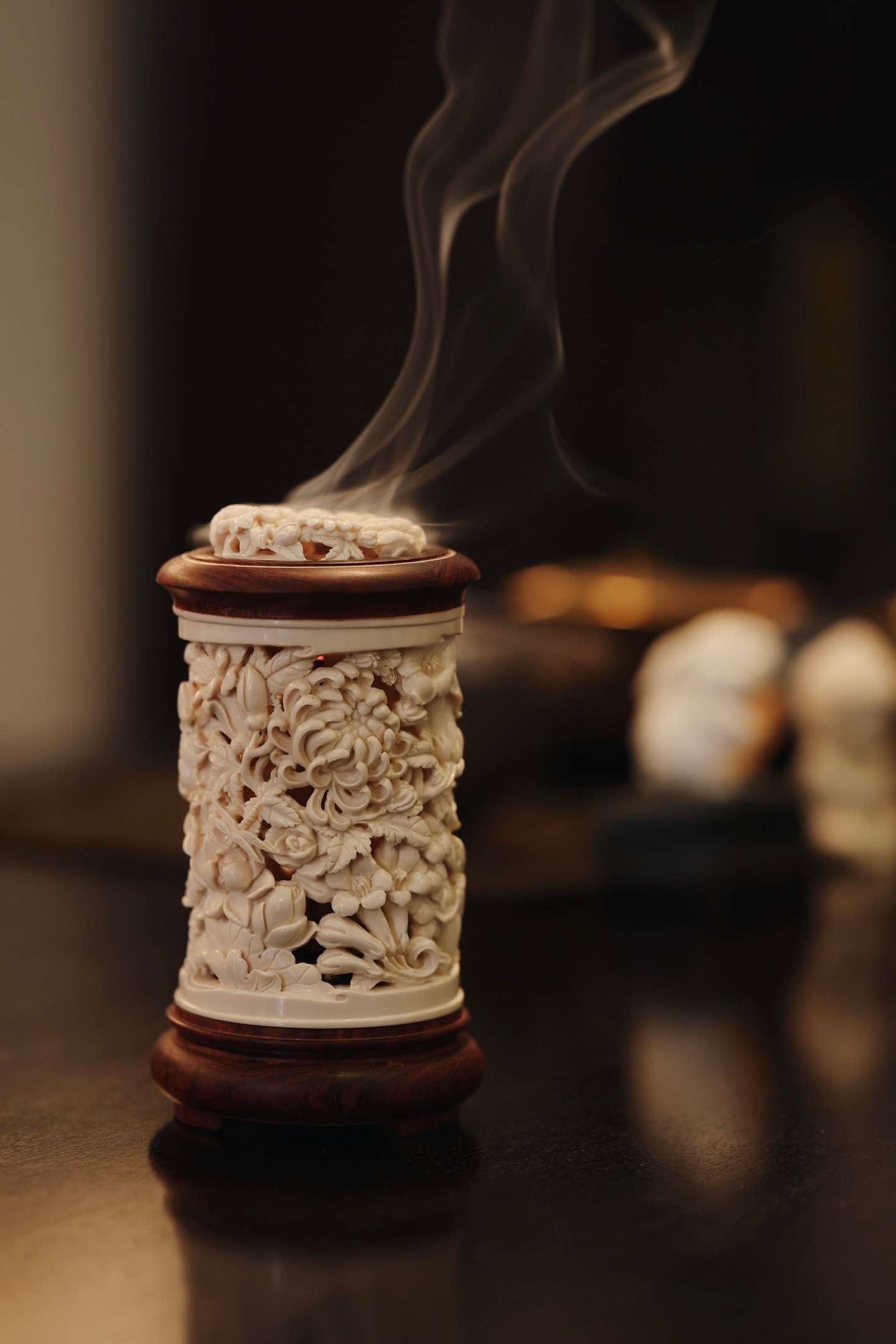 紫檀×猛犸 | 繁花 香炉雕刻细致,料色清雅细腻,镂空雕刻各式花卉饱满流畅,布局疏朗,焚香幽赏,风雅入骨,意趣自然。6.6*6.6*12cm 155g