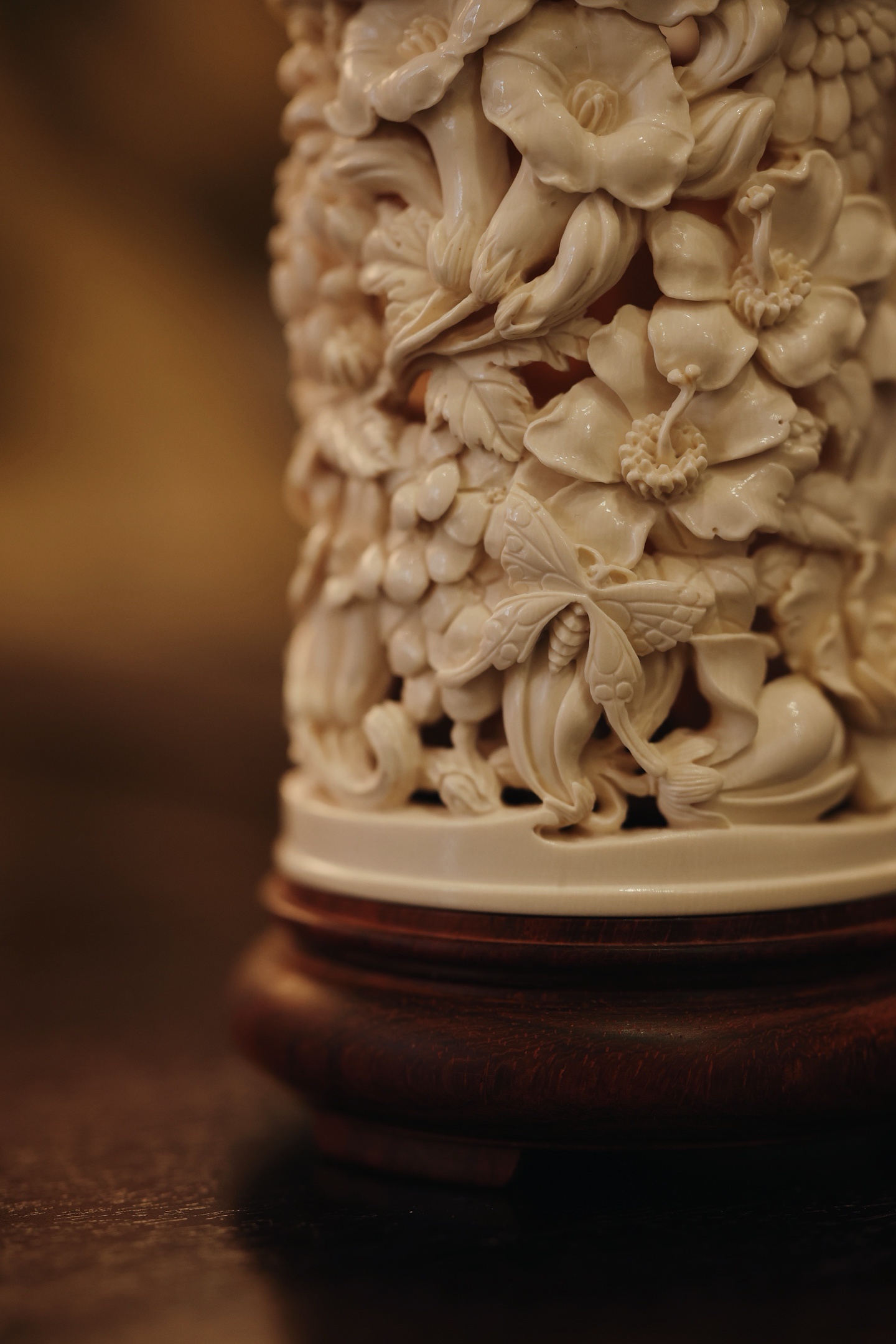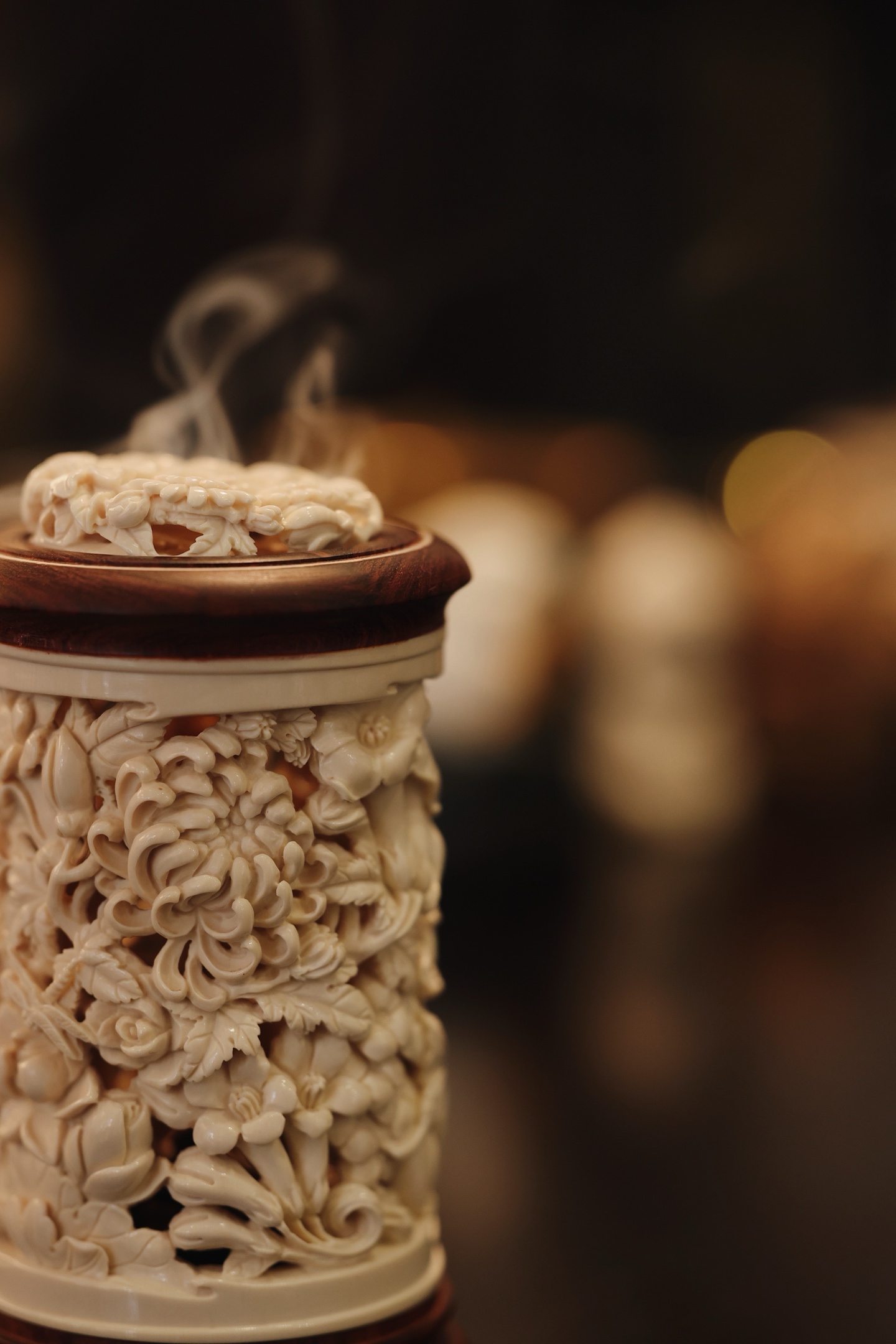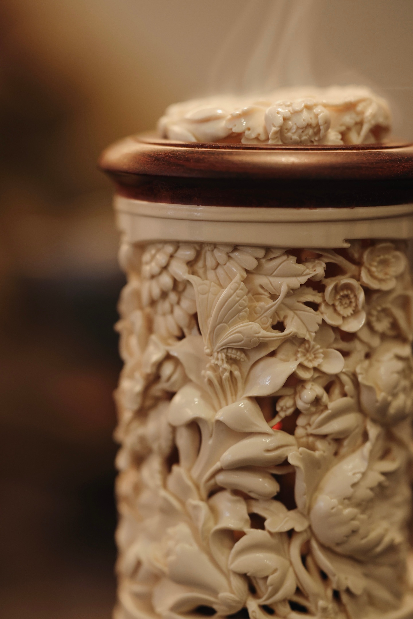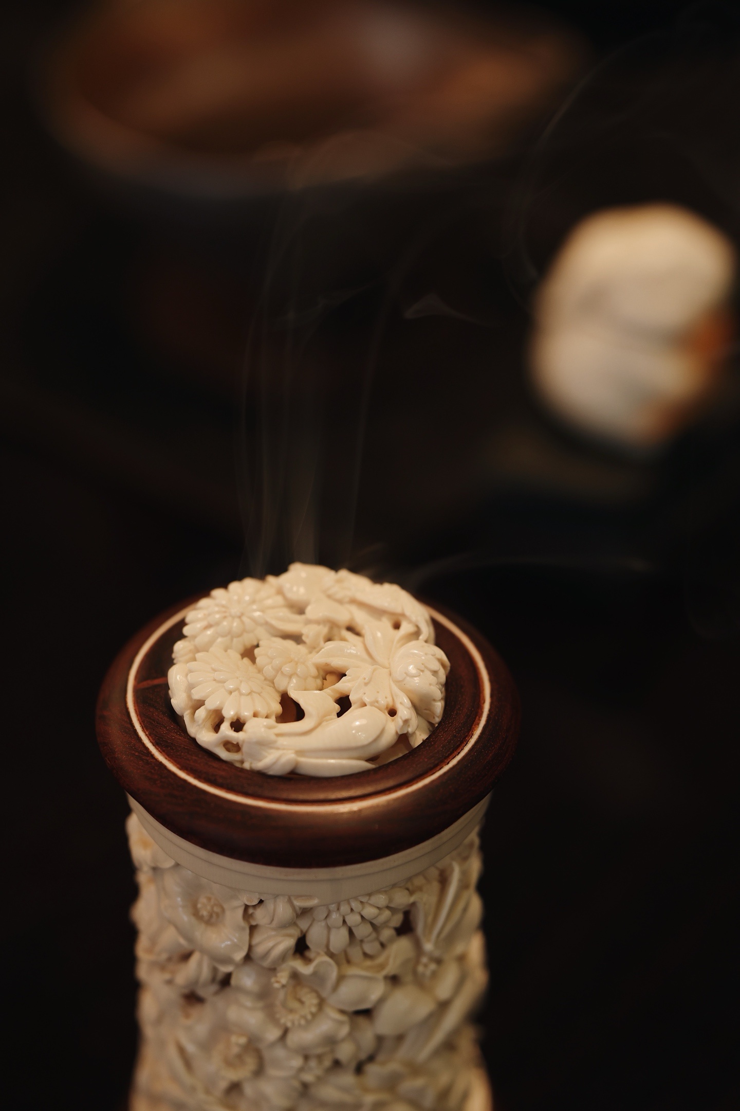 紫檀×猛犸 | 繁花 香炉雕刻细致,料色清雅细腻,镂空雕刻各式花卉饱满流畅,布局疏朗,焚香幽赏,风雅入骨,意趣自然。6.6*6.6*12cm 155g