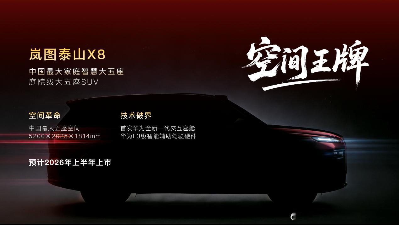 岚图泰山X8是岚图冲击高端新能源市场的关键车型,品牌形象主打“央国企高端新能源第一品牌”,走“技术平权+中式豪华”路线,靠华为赋能的智能配置和自主研发的硬件实力,打破传统豪华品牌溢价,重新定义华系旗舰SUV标准。上市周期很明确,计划在2026年上半年正式上市,属于岚图2026年“4车战略”的重要组成部分,和其他三款新车一起密集布局高端市场,形成持续的市场攻势。主打的用户市场特别清晰,就是“庭院级大五座”需求的家庭用户,瞄准75后到95后的跨代际精英群体——他们既要承担家庭责任,又追求生活品质和智能体验,可能是传统豪华品牌的增换购用户,也看重超大空间、高阶智驾和高性价比的平衡,不迷信品牌溢价,更在意实打实的产品价值。岚图汽车新品大爆发 岚图泰山四激光三月交付 岚图梦想家L3率先推出