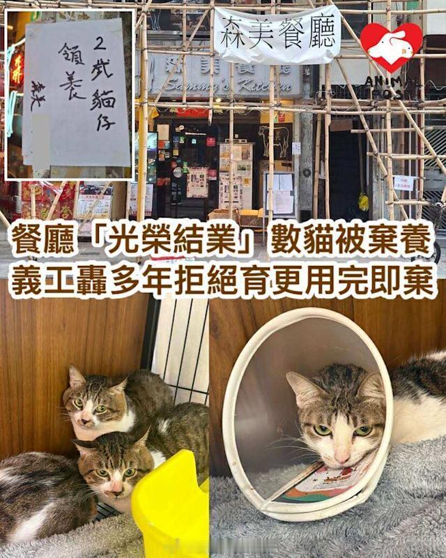 要爱护动物 「香港西營盤森美餐廳光荣结业 卻棄養多隻猫 義工轟用完即棄..」【動物專訊】西營盤森美餐廳日前結業,但「光榮結業」的背後,卻是多隻貓貓被棄養。毛守救援近日接收了3隻森美餐廳的貓貓,毛守Kent指,有資深貓義工與該餐廳就養貓問題糾纏多年,因為餐廳一直不肯為貓絕育,只用作捉老鼠,現在更「用完即棄」。他又指,餐廳老闆不誠實,最初對義工說只剩1隻貓要救走,沒想到最終是3隻,他擔心會否仍有貓留在已結業的餐廳內。早前有市民在網上發帖,指森美餐廳本月結業,需要為一隻2歲貓貓尋家。據知該貓貓其後獲人收養,但沒想到被棄養的貓貓不只那一隻。Kent表示,香港西營盤資深貓義工多年來一直跟進森美餐廳的養貓問題,「她和餐廳糾纏了很多年,餐廳因為要用貓捉老鼠,一直不肯絕育,不斷生又不斷將貓B給別人。」早前該餐廳聲稱在結業前為一隻兩歲貓貓尋家,沒想到原來被用完即棄的貓不只一隻。該資深義工日前聯絡餐廳老闆想救走貓貓,最初對方說還有1隻貓,沒想到最終竟是拿出了3隻約7、8歲的貓貓,而且樣子一模一樣,顯然是同胎的。該義工其後將3隻貓交由毛守救援照顧。據了解,該餐廳之前還有一隻剛懷孕的貓媽媽,其後由員工接走收養。Kent批評老闆一直就貓的數量說謊,擔心現時已關門的餐廳內還有貓未獲救起。他形容,該餐廳所謂光榮結業,其實是用完即棄,貓貓們長年被用作捉老鼠,餐廳又不肯為他們絕育,最終下場是被人棄養,令他感到憤怒。(來源:香港動物報 Hong Kong Animal Post..) 香港