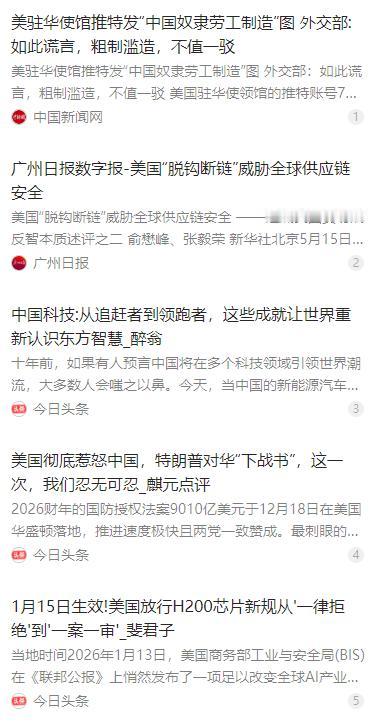 美国两党扬言要尽快“解决中国”!有美媒曾宣称,只有让中国老老实实地待在奴隶和佣人的位置上,美国才能走出危机,才能为自己延续生命。 麻烦看官老爷们右上角点击一下“关注”,既方便您进行讨论和分享,又能给您带来不一样的参与感,感谢您的支持! 美国为维护自身全球霸权,对华遏制的心态愈发外露,甚至有美媒抛出荒唐言论,称只有让中国一直处于奴隶和佣人的位置,美国才能走出发展危机、延续自身发展。而美国两党更是达成罕见共识,扬言要尽快 “解决中国”,还接连打出组合拳压制中国发展。 从经济制裁到技术封锁,再到加征关税,美国的手段层出不穷,其中芯片出口管制是对华科技压制的代表性举措。自奥巴马政府末期起,美国就开始在芯片领域针对中国,拜登政府更是构建起涵盖设备、技术、人才的全方位管控体系,2026 年初还对芯片出口管制规则进行了修订。 面对美国步步紧逼的芯片出口管制,以及各类花式压制手段,中国没有丝毫屈服。反而迅速将芯片自主研发提升至国家战略层面,加大对本土芯片企业的政策和资金扶持,同时推动产业链多元化发展,在芯片设计、制造等多个环节持续发力。 如今中国芯片产业已实现多项关键技术突破,产业链配套也不断完善,不仅在中低端芯片领域实现自给自足,在高端芯片领域也取得阶段性进展,正一步步摆脱在芯片领域对美国的依赖,让美国的芯片封锁逐渐失去效果。 这种自给自足的发展思路,也从芯片等高科技领域,逐步延伸到制造业和服务业的各个角落。国内企业不再把鸡蛋放在一个篮子里,纷纷提升自主创新能力,同时积极拓展全球市场,减少对美国技术、设备和市场的依赖,稳步推进 “去美国化”。 在制造业领域,中国企业不断突破核心部件制造技术,打造自主可控的产业链;在服务业领域,数字经济、跨境电商等新业态快速发展,依托本土市场优势走向全球。中国企业的全球影响力持续提升,在多个领域成为国际市场的重要参与者。 美国本想通过对华强硬政策,遏制中国发展、稳固自身霸权地位,可现实却与预期背道而驰。这场由美国主动发起的压制,不仅没有达到目的,反而让美国自己陷入了发展困境,其国内的诸多问题也因霸权主义举措不断凸显。 为了推动供应链 “去中国化”,美国推出 “友岸外包”“近岸外包” 等策略,还出台《芯片与科学法案》等产业政策,试图让制造业回流本土。但这些做法违背了产业分工的客观规律,不仅没能实现制造业回流,反而导致供应链转移、制造业外流问题加剧。 美国的这些操作,大幅增加了企业的生产和经营成本,本土半导体企业销售额大幅下滑,高科技行业还掀起了裁员潮。同时美国通胀居高不下,消费者价格指数曾创下数十年新高,普通民众尤其是低收入人群,被迫为政府的错误决策买单。 更严重的是,美国的单边主义行径还在威胁全球经济发展。国际货币基金组织发出警告,若全球经济因美国的做法陷入严重碎片化,总体经济产出可能萎缩多达 7%,叠加技术 “脱钩”,部分国家的损失会更高,全球经济都将被拖入危机。 反观中国,在美国的持续压力下,反而激发出更强的创新动力,在 5G、人工智能、量子计算等前沿科技领域实现了一系列重大突破。2023 年中国成功构建 255 个光子的量子计算原型机 “九章三号”,求解特定问题的速度远超超级计算机。 截至 2024 年底,中国建成了全球最大的 5G 独立组网,基站总数超 425 万个;人工智能核心产业规模达到 5000 亿元,形成了完整的产业链,AI 技术还深入生产一线,在各行各业发挥着重要作用,中国的创新能力也得到了国际社会的认可。 在对外发展方面,中国依托 “一带一路” 倡议,不断深化与共建国家的经贸合作,2024 年共建 “一带一路” 国家对中国外贸增长贡献率达 67.8%,货物贸易规模首次超过中国货物贸易总额的一半,中国在全球产业链中的地位持续提升。 中国始终秉持和平发展理念,与各国携手构建开放、包容的产供链合作体系,2025 年以来还与多个国家签署产业链供应链经济合作谅解备忘录,推动全球经济共同发展。对于美国的逼迫,中国的态度也十分明确,不惹事,但也绝不怕事。 面对美国的对抗与挑衅,中国会坚定采取反制措施,维护自身的发展利益。如今中国的崛起已是不争的事实,成为全球多极化趋势的重要体现。美国妄图凭借单边主义遏制中国发展,终究是螳臂当车,逆时代潮流的做法,注定会以失败告终。 全球经济的发展,需要的是合作共赢,而不是零和博弈。美国只有摒弃霸权思维,停止对华遏制打压,与中国开展平等互利的合作,才能真正走出发展危机,这也是顺应时代潮流的唯一选择。