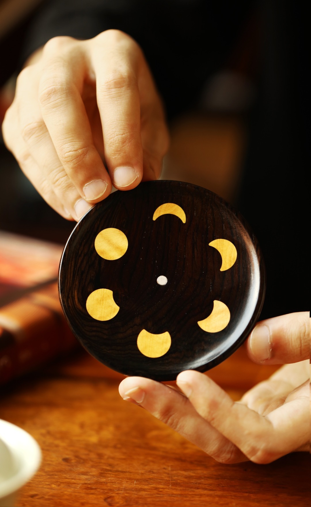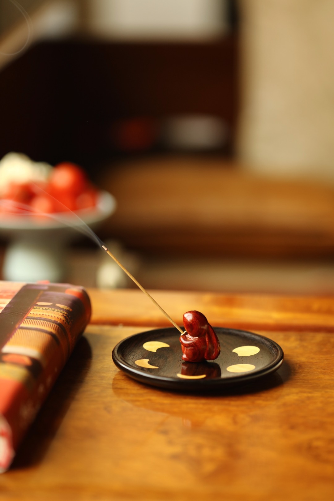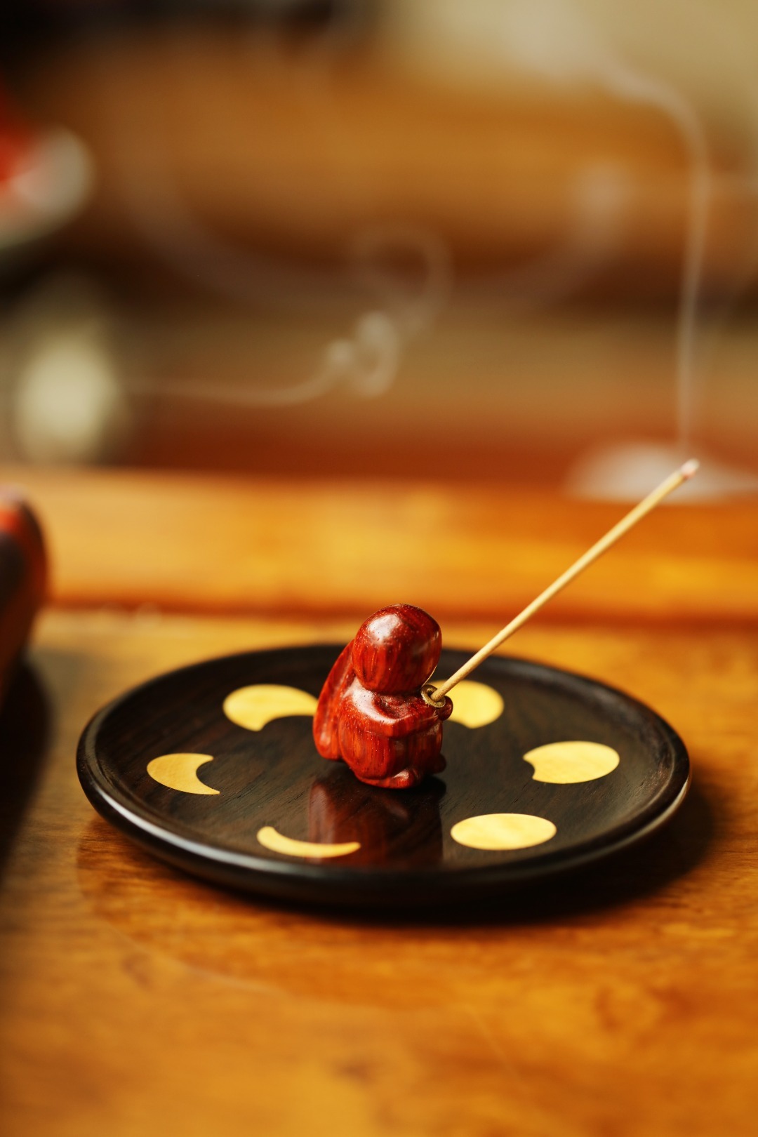 望月玉兔 | 香插月有阴晴圆缺,做一轮皎月,愿常相伴。小叶紫檀玉兔,底座紫光檀镶嵌黄杨木,以月食为题材。玉兔举香,莹润可爱,置书案燃香,足增清趣。9.8*9.8*3.5cm 小叶紫檀【望月玉兔】香插