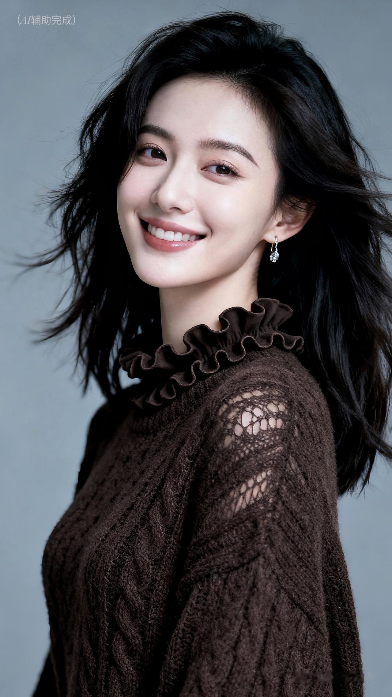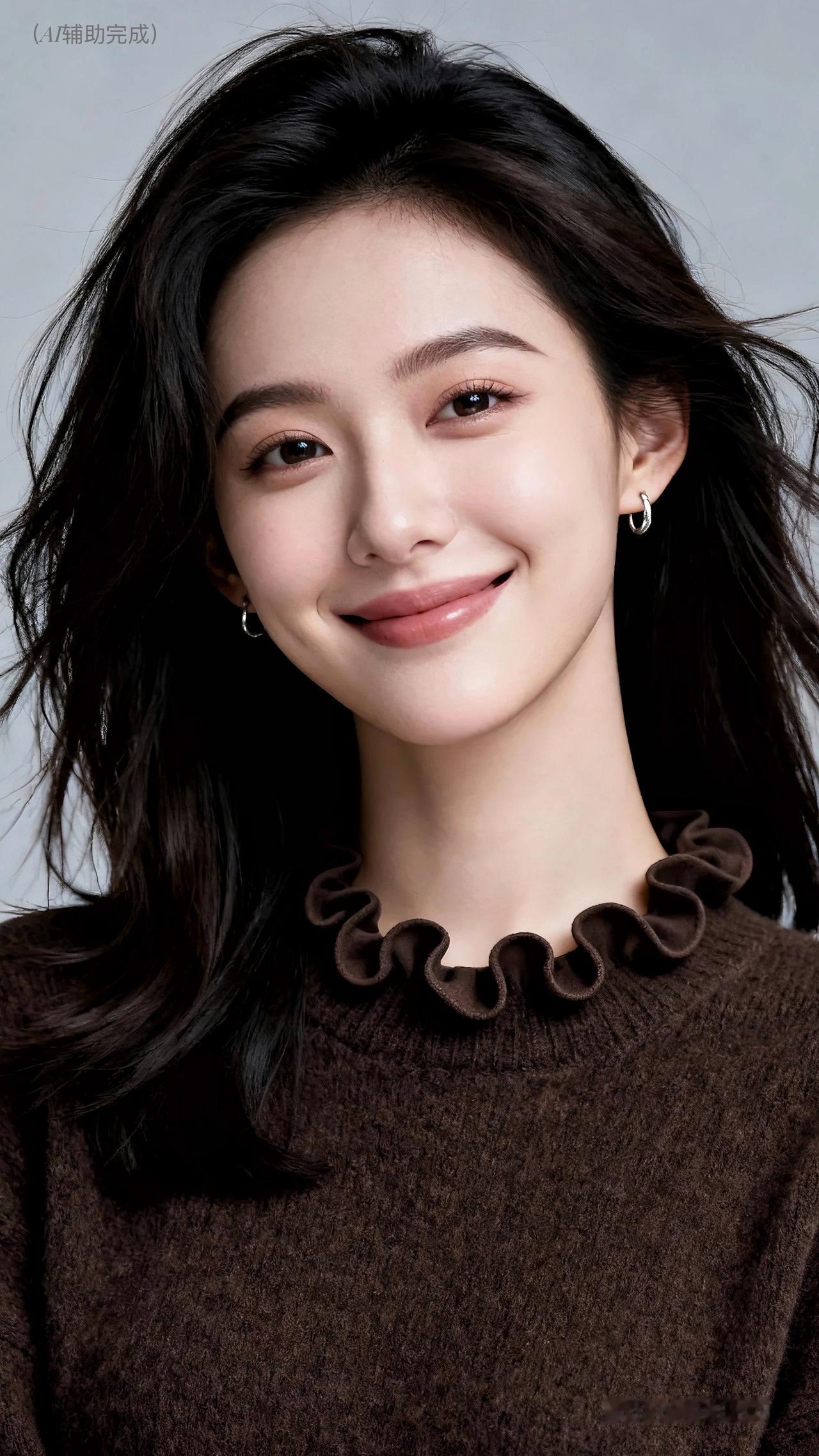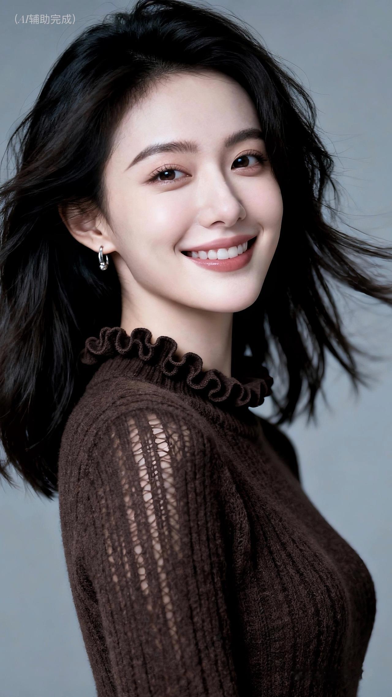 乌发如绸垂肩漾柔光,深棕毛衣荷叶边添俏,镂空纹理显精致。银环耳饰点睛,眉眼含笑眸藏星,甜笑露齿暖人心。浅灰背景衬温婉,治愈如沐春风境。这帧优雅美人,一眼沦陷!