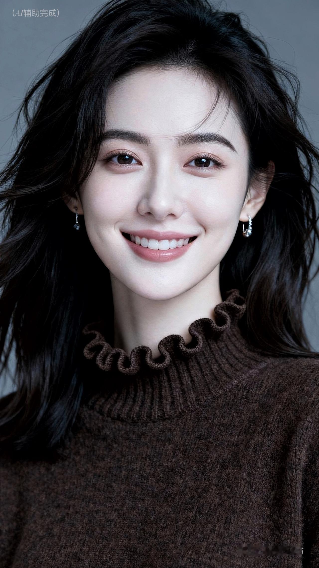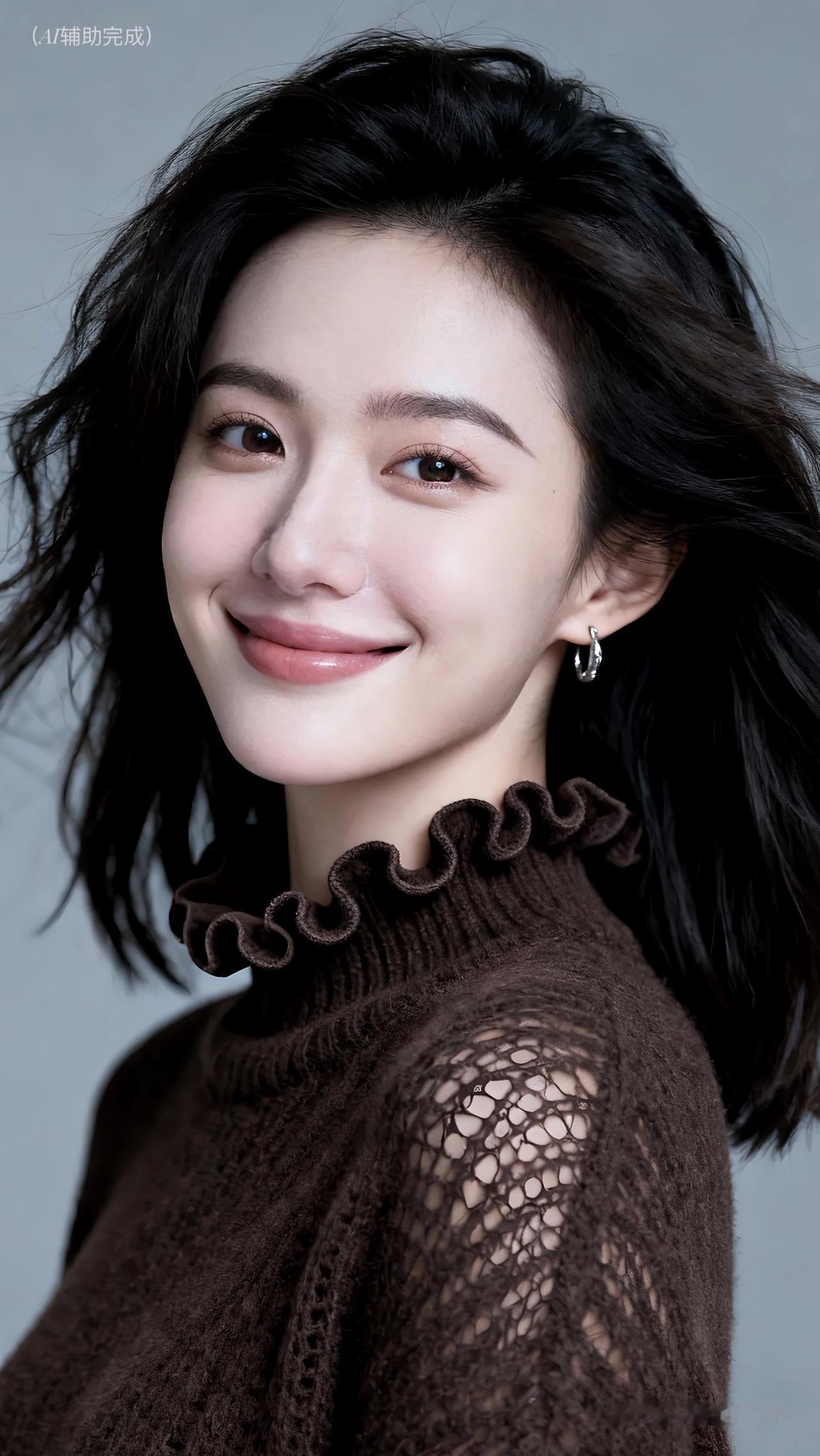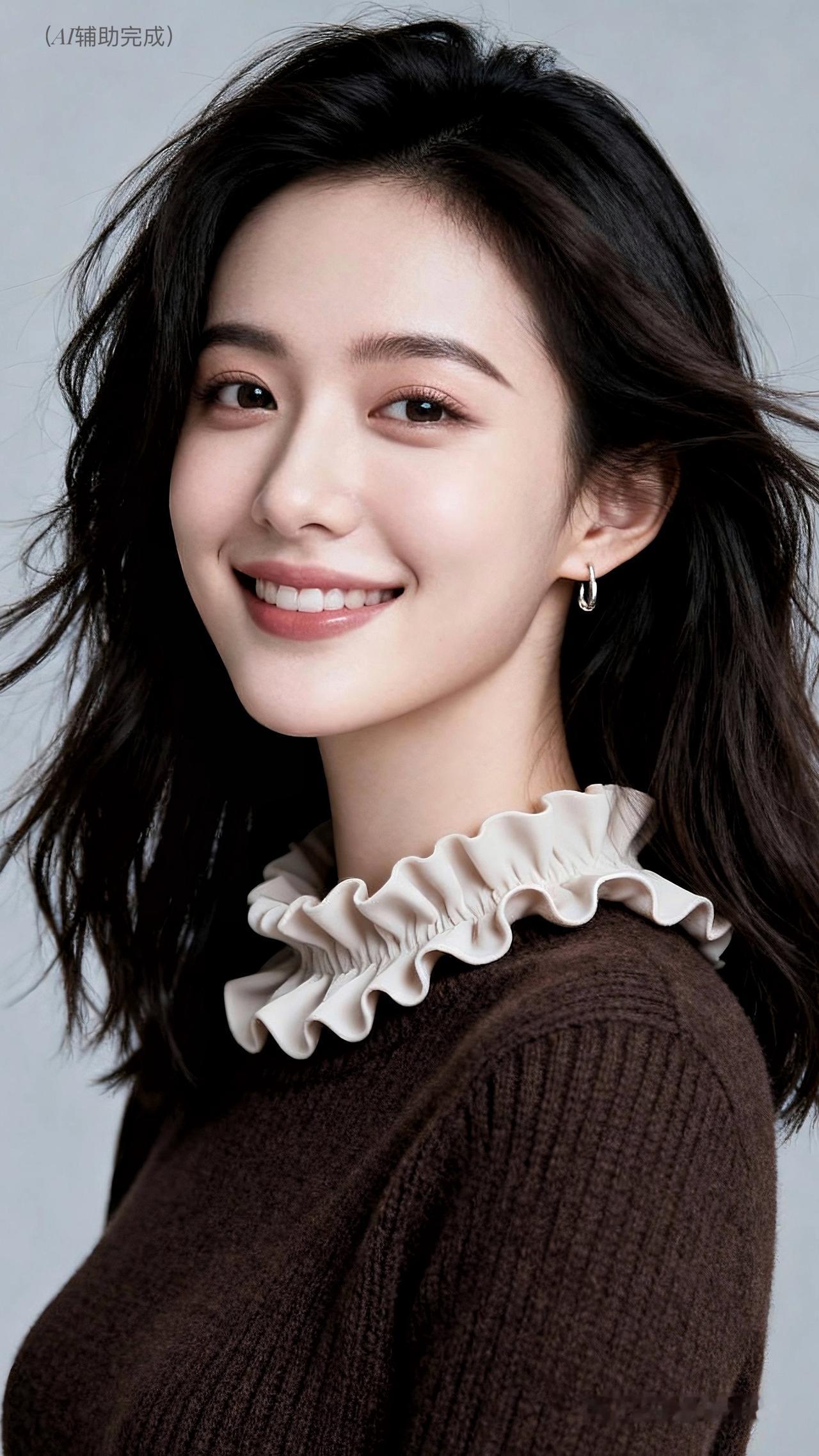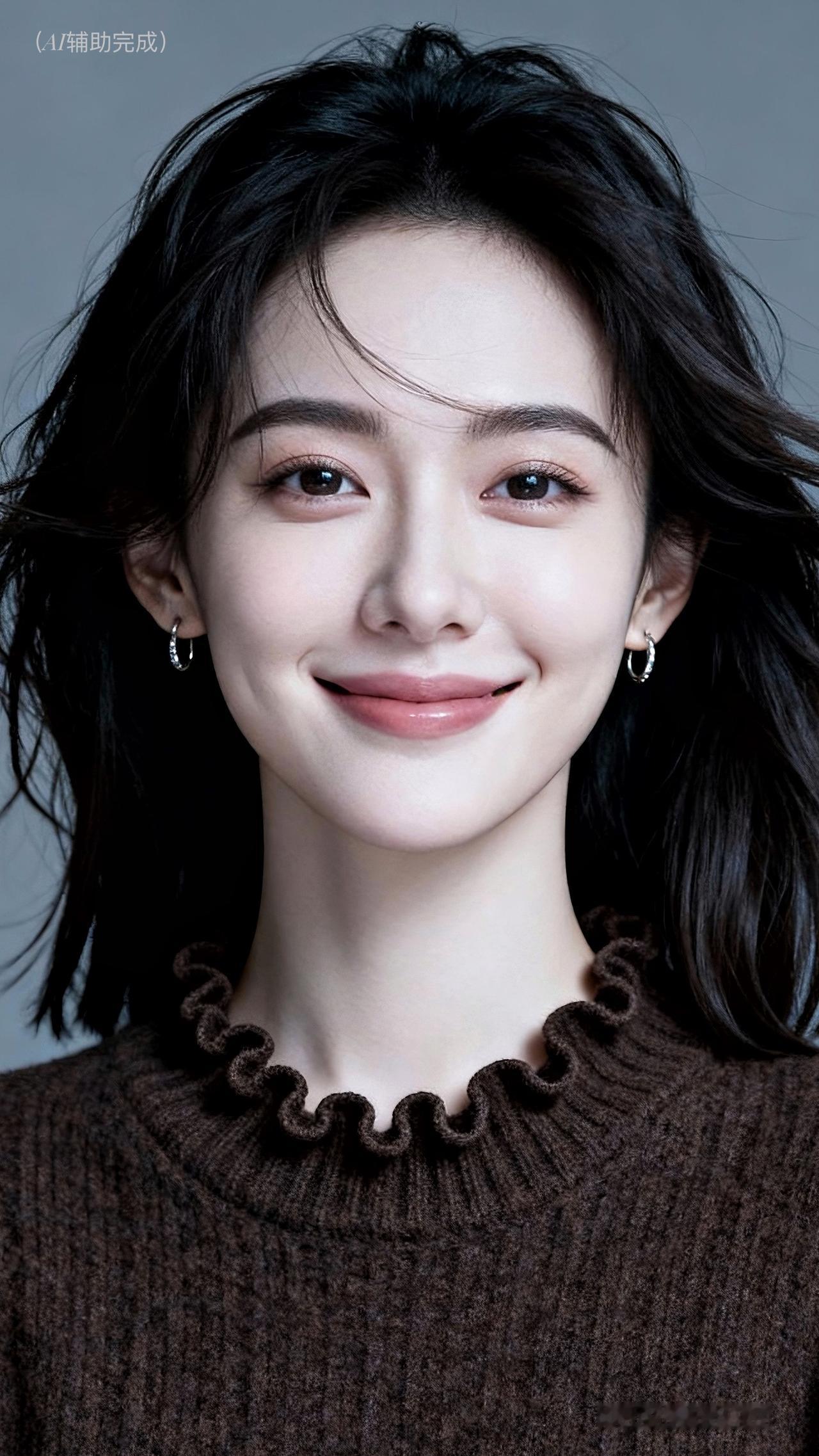 乌发如绸垂肩漾柔光,深棕毛衣荷叶边添俏,镂空纹理显精致。银环耳饰点睛,眉眼含笑眸藏星,甜笑露齿暖人心。浅灰背景衬温婉,治愈如沐春风境。这帧优雅美人,一眼沦陷!