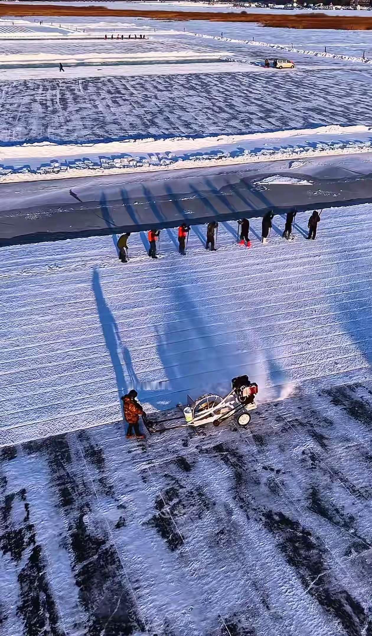 大自然鬼斧神工,将松花江变成了巨大的采冰场。 像采石一样,采冰一层层的,露出石头般的肌理。采的这些冰块将打造冰灯世界,璀璨夺目。 采冰像采石一样,也要有序开采,不然,五月份后,将无冰可采。