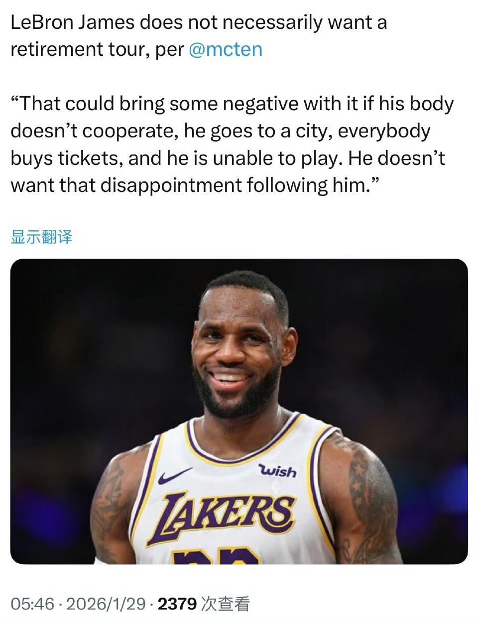 湖人记者Dave: “詹姆斯未必想要办退役巡演。如果他的身体状态不配合,去到一个城市,所有人都买了票,他却打不了,那可能会带来一些负面的影响,他不想让那种失望一直跟着自己。”