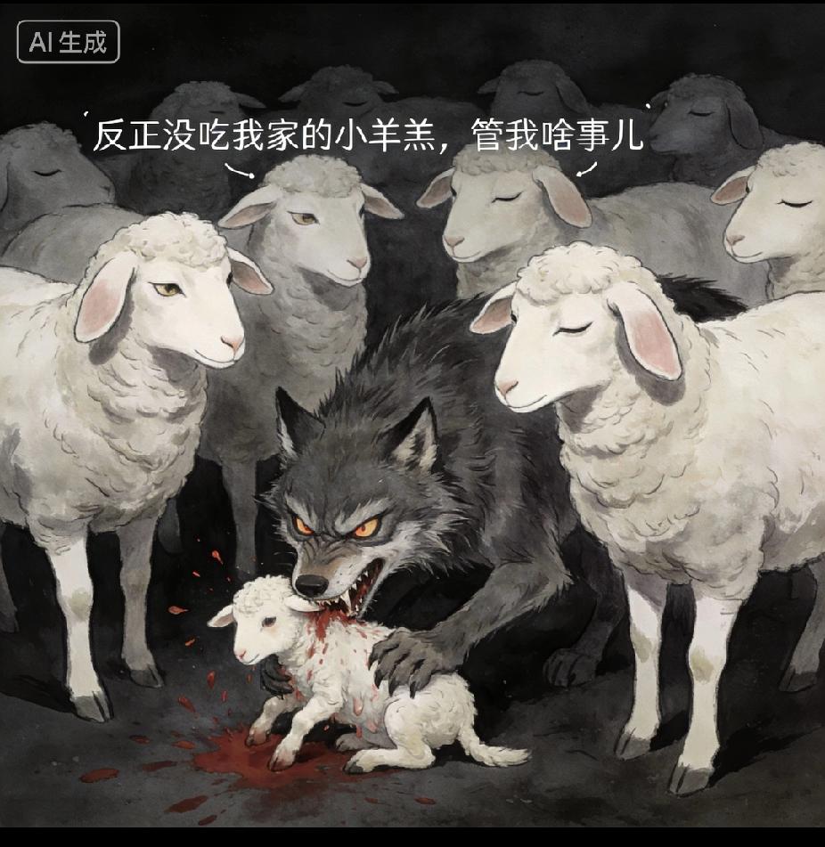 恶狼在吃小羊羔, 羊群里的所有大羊都装作看不见, 听不见。 事不关己, 所有的大羊都在想 反正没吃我家的小羊羔。 关我啥事儿? 其实羊这样想就错了, 如果所有的羊继续这样沉默, 在不久的将来, 恶狼会吃掉你们所有羊群的小羊羔。