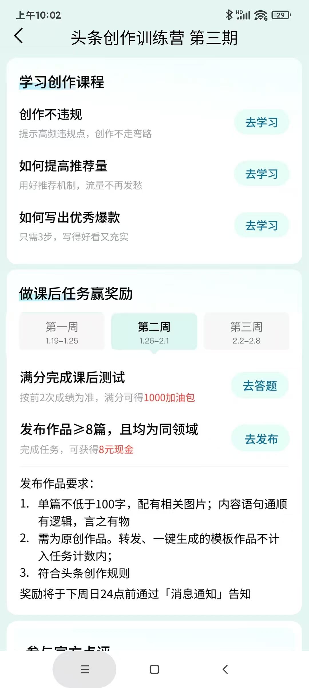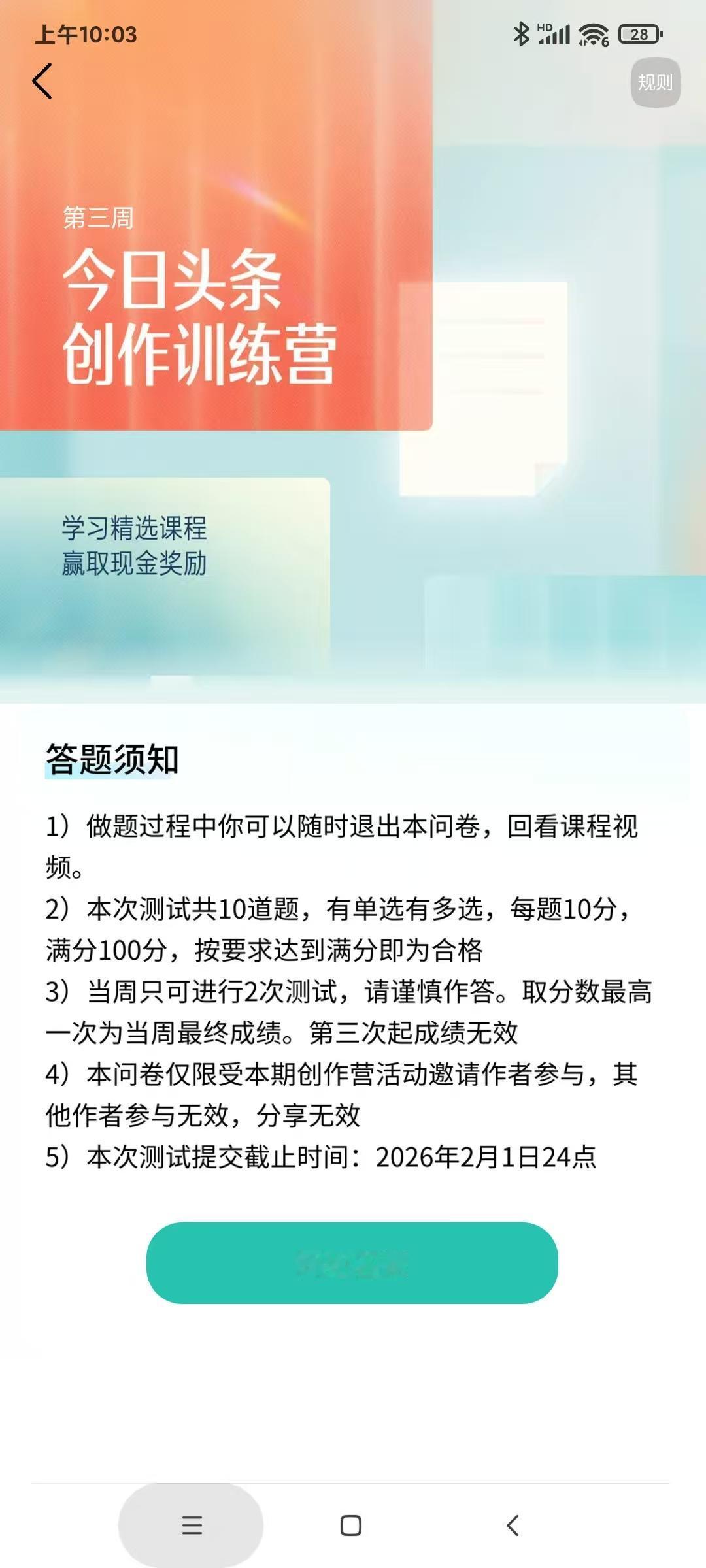 微头条小秘书发来消息,邀请我参加头条创作训练营的学习。我来头条已经五周年了,写作水平一直徘徊不前。 在这困顿的时刻,小秘书及时发来消息,恰似一缕春风,轻轻抚过我的心怀。我迫不及待地加入今日头条创作训练营,指尖轻触屏幕,课程页面便如画卷般徐徐展开。 学习创作课程分为三大模块:其一,严守规则,创作不违规;其二,掌握技巧,提高推荐量;其三,精炼文笔,写出优秀爆款。 本次创作训练营的学习计划为期三周。第一周,我全身心投入创作课程的学习,认真聆听每一场讲座,并在讲座结束后立即参加答题测试,最终以满分成绩通过,心中充满了欢喜与成就感。第二周,我再次参加课程培训,温故知新,重新聆听课程内容,答题测试同样斩获满分。 如今,我正满怀期待地等待第三周的学习到来。 通过前两周的系统学习,我提高了很多。感觉对文章的写作,不能提笔就写,想到哪里就写到哪里。要先有明确的思路,要在书本上或脑海中打草稿,先写什么后写什么,要表达什么,有一个文章的总体构思。 我以前写过好多文章,都是想到那就写到那,没有一个总纲。 通过这次聆听课程的讲解,写作思路有提升,垂直领域也很透彻,效果也很突出,道理也明白,两次测试皆是满分,就是写不出来作品。 朋友们是不是和我一样,也有这个感受,说出你的见解。