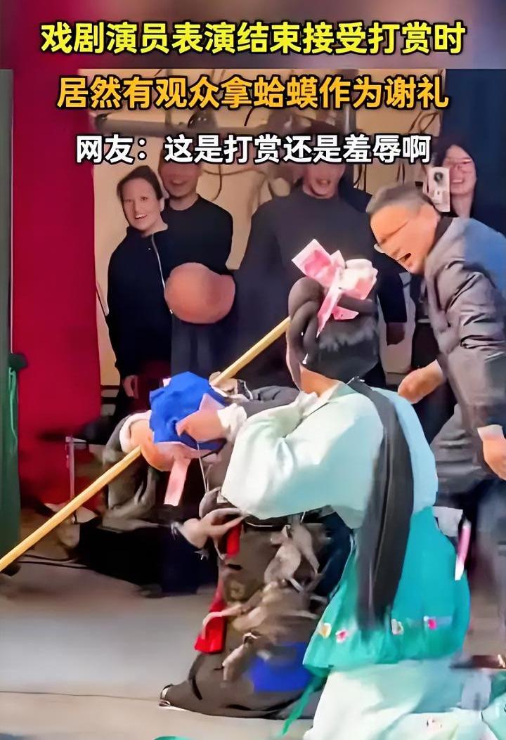 戏剧表演打赏,见过给钱的,见过给米面油的,给牛蛙的还是头一次见。 两位演员正表演投入,突然从后面窜上一位观众,手里拎着两串牛蛙,二话不说挂在演员脖子上。 其中一位女演员吓得花容失色,直接停止了表演,尖叫起来,工作人员急忙跑上来把牛蛙拿了下来。 虽说这一串牛蛙也挺贵,但是打赏这东西,难道不是故意让演员出丑? 如果真的欣赏演员的表演,就不该打赏这种东西。