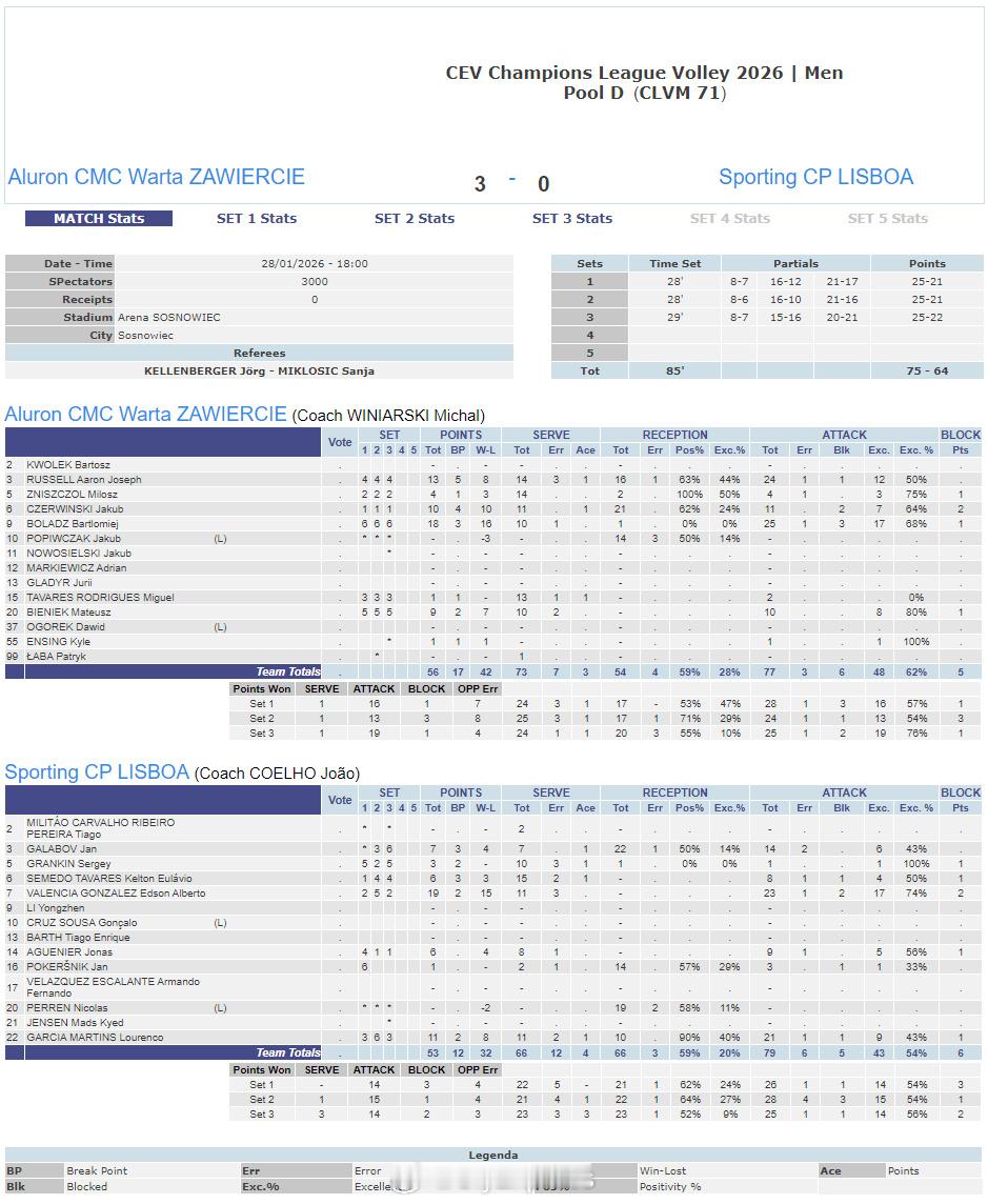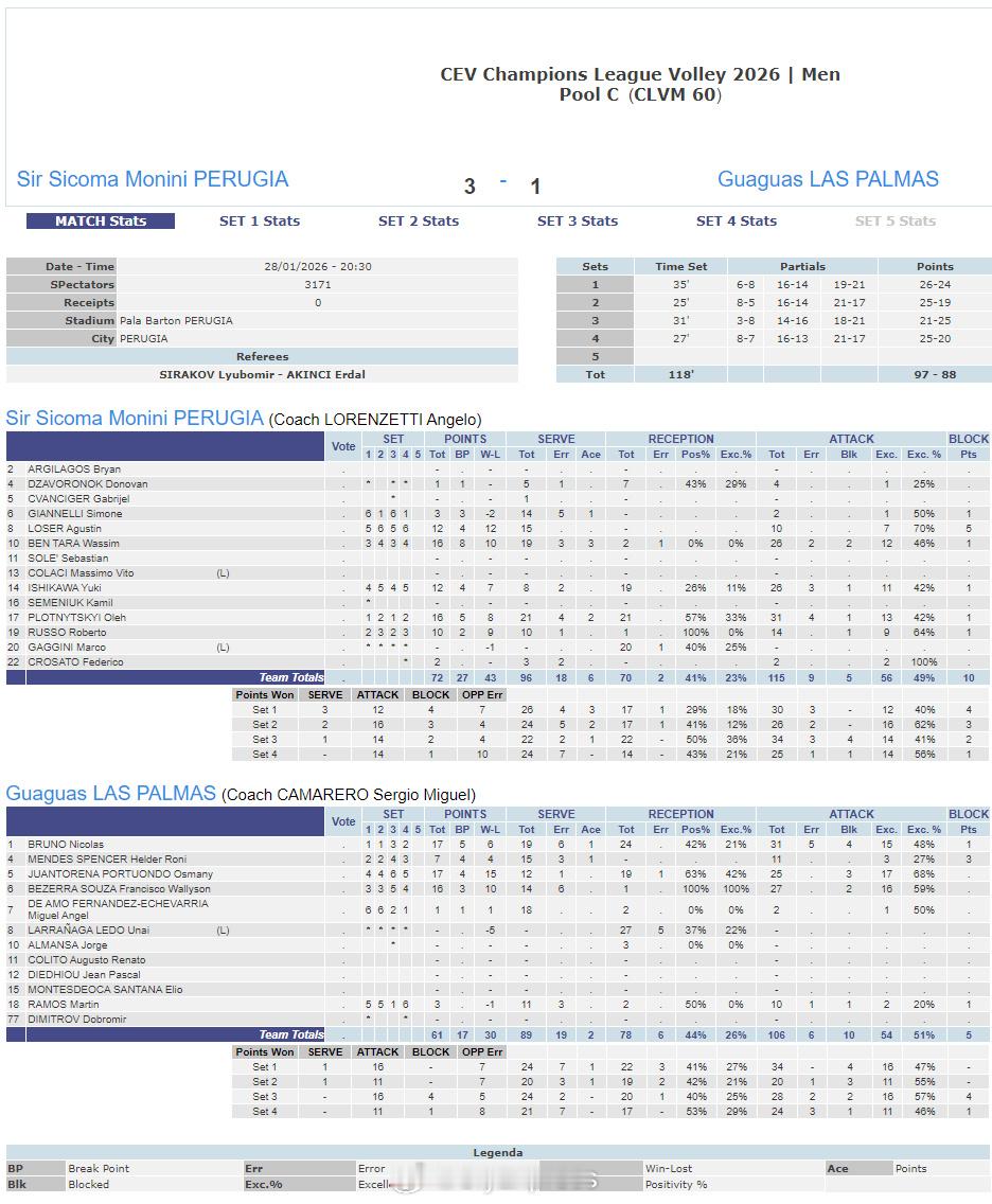 【欧冠男排佩鲁贾3-1拉斯帕尔马斯 胡安托雷纳17分勇冠三军】国际排坛战报速递1月28日,欧冠男排第四轮第四回合,C组意大利佩鲁贾主场3-1(26-24/25-19/21-25/25-20)击败西班牙拉斯帕尔马斯,四连胜领跑。本塔拉和MVP普罗特尼茨基各16分、卢瑟和石川祐希各12分、鲁索10分,布鲁诺和胡安托雷纳各17分、贝泽拉-索萨16分。另外三场赛果如下:D组:波兰扎维尔切3-0(25-21/25-21/25-22)葡萄牙里斯本竞技,李咏臻未获出场机会A组:土耳其农业银行3-0(25-21/25-21/25-20)斯洛文尼亚卢布尔雅那E组:波兰华沙3-0(28-26/25-23/25-20)法国蒙彼利埃