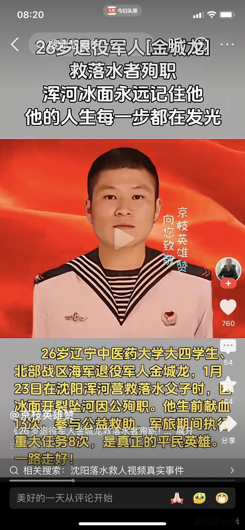 太可惜了!26岁大学生为救父子俩不幸牺牲。 2026年1月23日下午1:40左右,在辽宁沈阳,一位26岁的大学生为救一对落水父子不幸牺牲。 据悉,救人者是北部战区海军退役军人返校复学的大学生金城龙,当时金诚龙为贴补家用,他在沈阳浑河参加了一剧组群众演员,下午1:40剧组在拍摄间隙,金成龙听到河对岸传来了一对父子急促的呼救声,金诚龙闻讯后操起一根木棍奋不顾身地向父子俩奔去。然而当他快接近父子俩的时候,冰面突然断裂导致金城龙坠入冰河中,但他还是奋力伸手抓住了在水中挣扎的孩子,只见他用双手托起托举起孩子,最终,七岁的孩子被故起,孩子的父亲和金城龙不幸溺亡。 1月25日,记者来到金城龙家了解接到金诚龙生前曾多次获奖,并执行过八次重大任务,曾经献血13次,就在前两天才刚献完血。金成龙曾在日记中写道:无名无利无悔,有情有义有祖国。金城龙的父亲哽咽着说:我理解儿子的选择,如果是我在现场我也会去救人的。 金城龙的女友称:他们原定在近期结婚的。 致敬英雄少年金城龙。[祈祷]你时刻准备着帮助他人,紧急时刻挺身而出,你是真正的平民英雄。你用生命诠释了一名军人的责任与担当,为当代年轻人树立了光辉的榜样。[赞][赞]