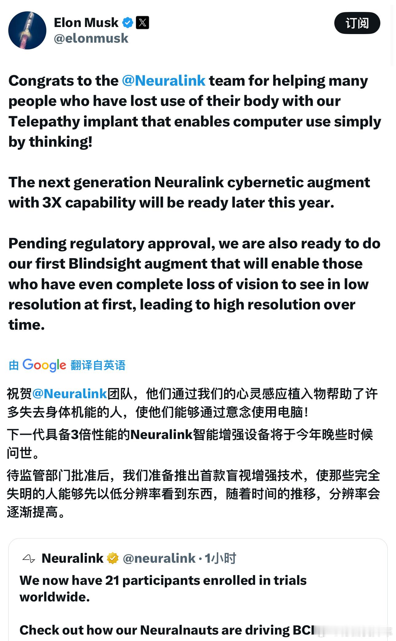 Neuralink 已准备好首次将全新的脑机接口芯片 Blindsight 植入人类患者,但植入方案仍需等待监管批准,该方案旨在为完全失明的人恢复视觉能力。马斯克表示:“即使是完全丧失视力的人,也能先获得低分辨率的视觉,随后随着时间推移,逐步提升到高分辨率。”此外,Neuralink 的下一代 赛博增强(cybernetic augment)技术正在推进中,整体能力将提升约 3 倍,预计在 2026 年底 准备就绪。在手术层面,Neuralink 的下一代手术机器人将大幅提升植入效率,神经线程的植入速度将从上一代的 17 秒,缩短至 1.5 秒。Neuralink