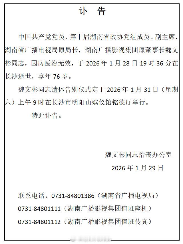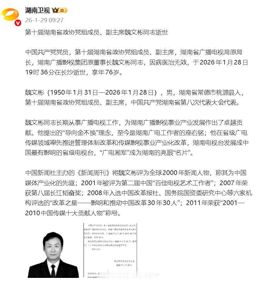 湖南广电原局长魏文彬去世 据湖南卫视,中国共产党党员,第十届湖南省政协党组成员、副主席,湖南省广播电视局原局长,湖南广播影视集团原董事长魏文彬同志,因病医治无效,于2026年1月28日19时36分在长沙逝世,享年76岁。