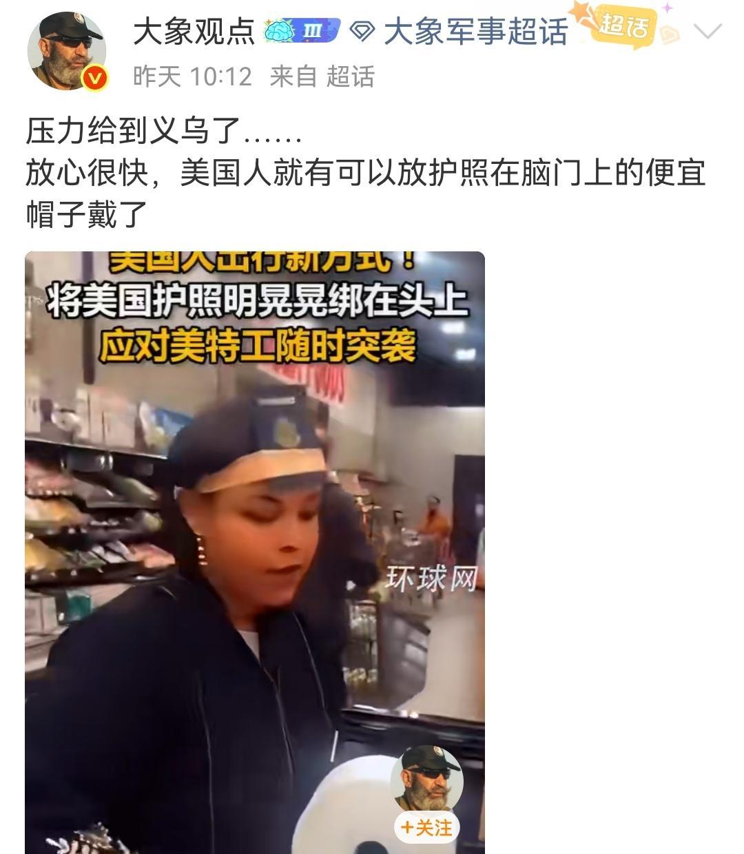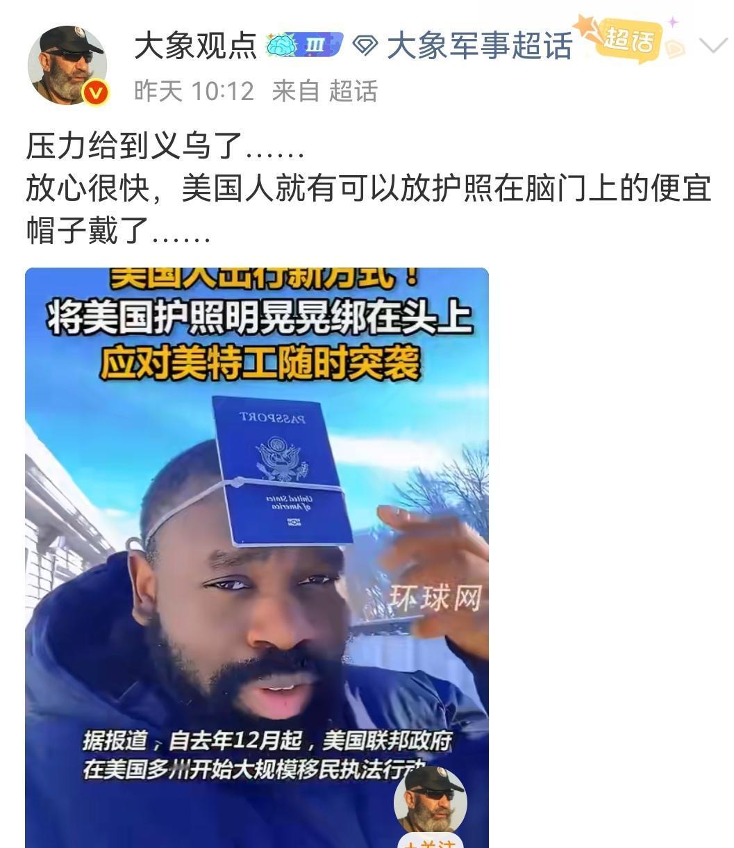 义乌商家赶快开发美国护照帽。 (如图所示)美国查非法移民的动静闹得可真大,最可怕的是,任何人稍有不配合就可能被爆头,于是乎很多美国人只能把护照绑在脑门,意思是:“我可是美国人,千万别开枪”。既然需求这么大,中国浙江义乌的商家赶紧开发出功能齐备、佩戴方便的护照帽子,充分满足美国市场的需求。