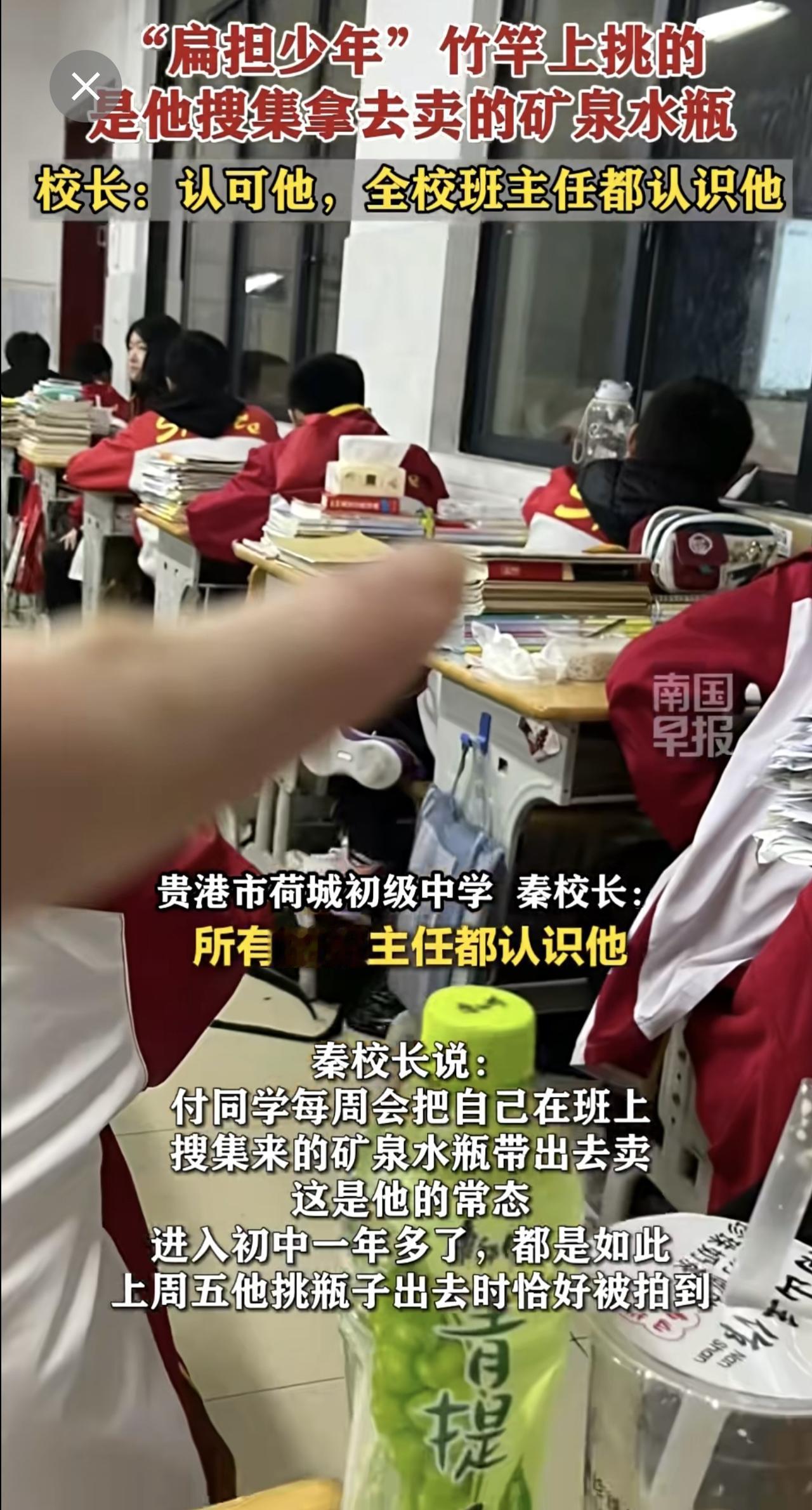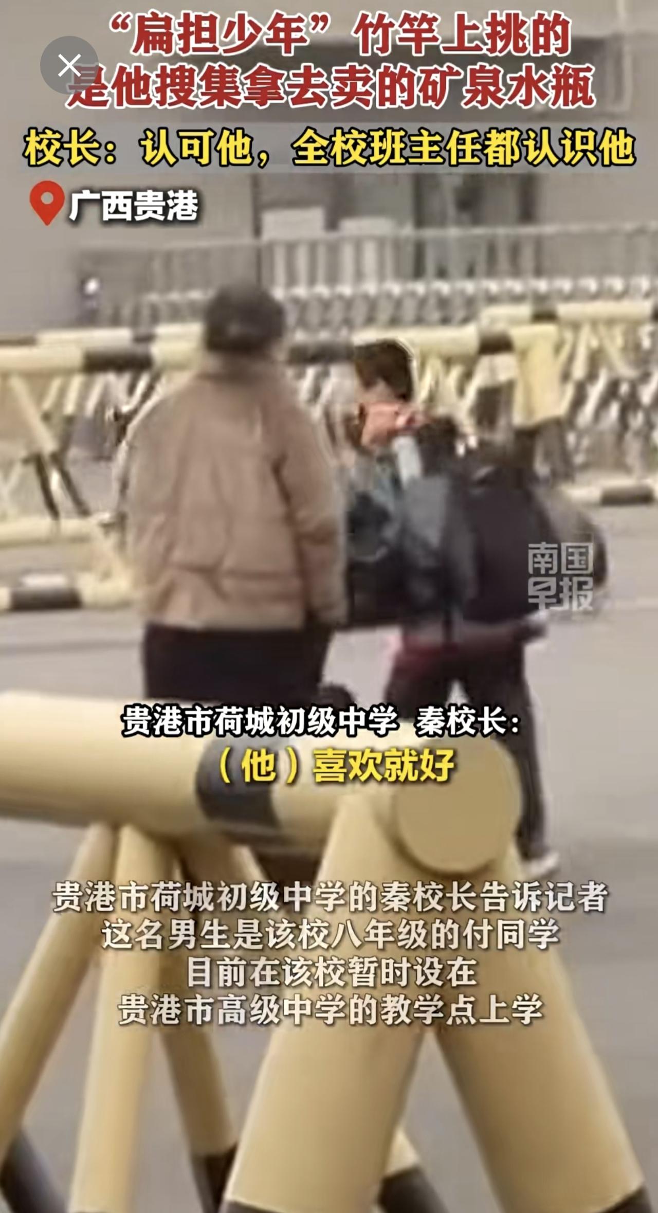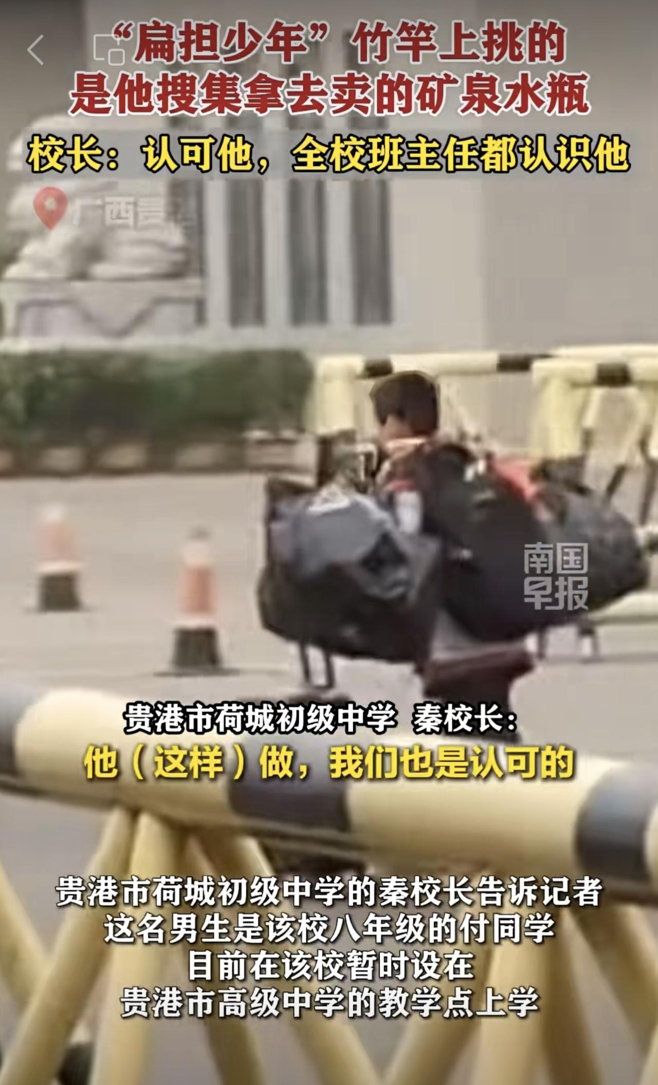(视频来源:南国早报)“扁担少年”竹竿上挑的,是他搜集拿去卖的矿泉水瓶。校长:认可他,全校班主任都认识他励志 矿泉水瓶 勤俭节约