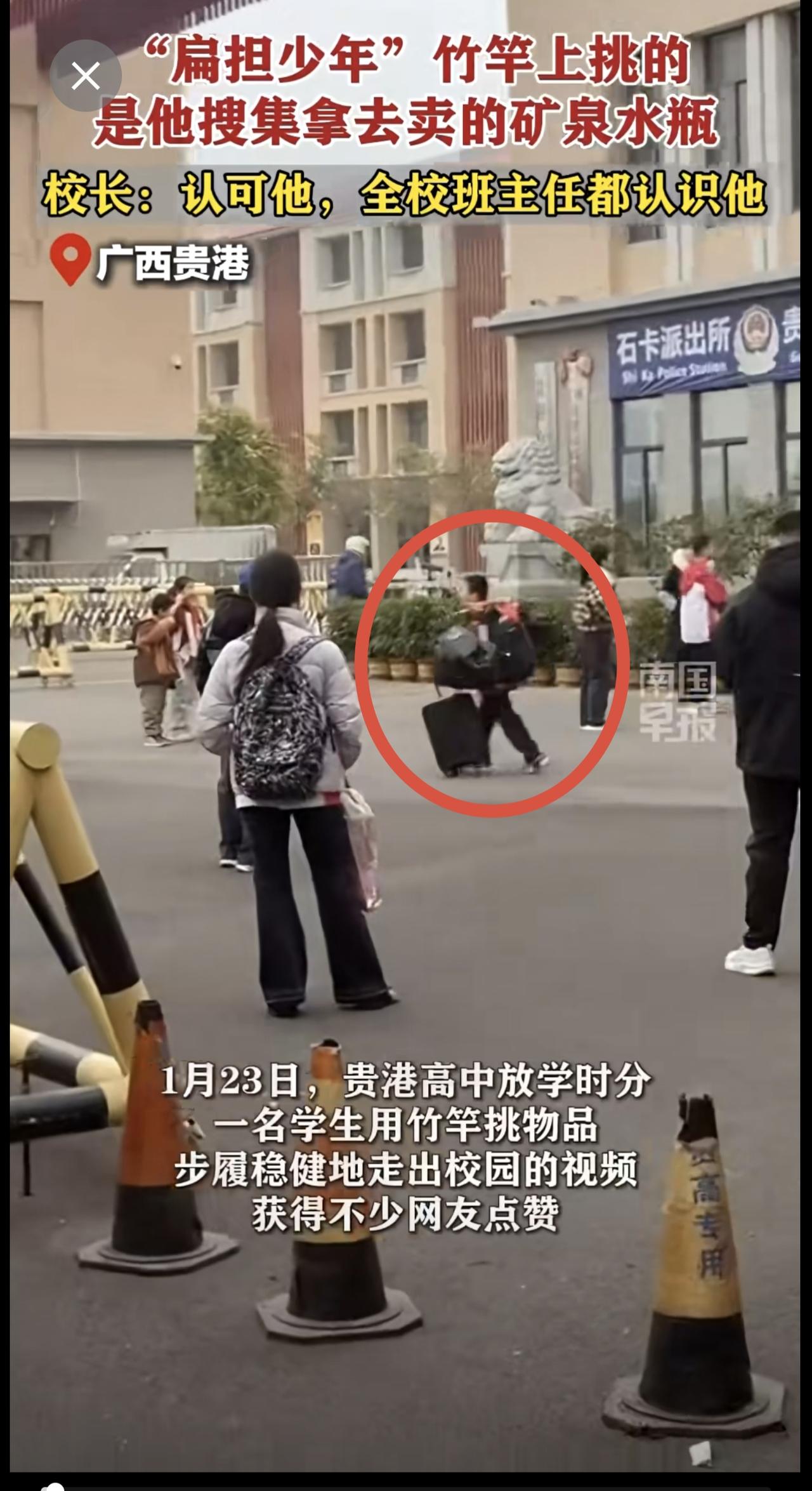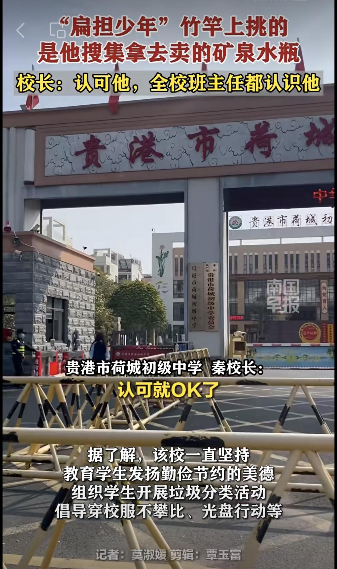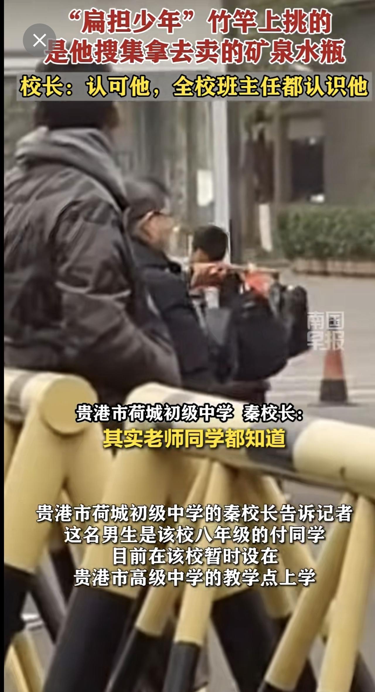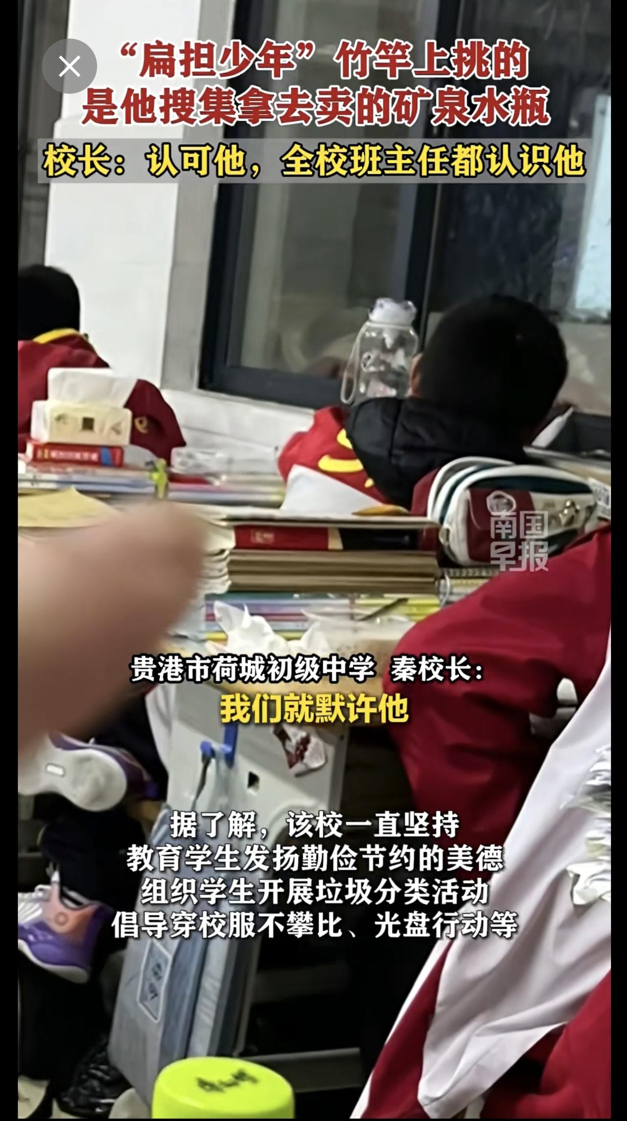 (视频来源:南国早报)“扁担少年”竹竿上挑的,是他搜集拿去卖的矿泉水瓶。校长:认可他,全校班主任都认识他励志 矿泉水瓶 勤俭节约